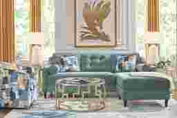 Combining classic and contemporary styles, the Hanover sleeper chaise sofa from Cindy Crawford Home delivers class and comfort. Upholstered in soft chenille fabric, this piece features a vibrant teal color to refresh your space. Sleek track arms, welting details and tufting on the back cushions give it a designer look. The reversible chaise can be floated to either end of the sofa's frame by simply flipping its seat cushion. Offering form and function, its tapered legs claim a dark espresso finish. Matching bolster pillows, included, enhance the modern look. Plus, a pair of accent pillows showcases a contemporary pattern inspired by watercolor art. Tucked inside, a Sealy Royale queen mattress transforms this sofa chaise into a bed for overnight guests. Upholstery: 100% Polyester
