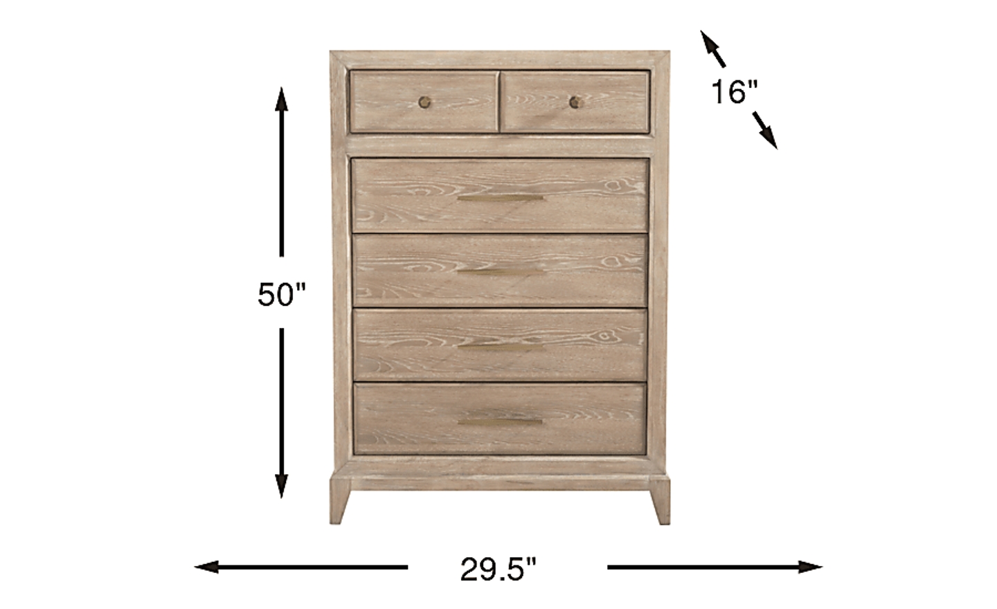 Upgrade your bedroom's storage setup with the stunning Kailey Park chest from Cindy Crawford Home. Contemporary in style, this piece is crafted of hardwood solids and oak veneers in a light oak finish that can brighten up your space. Its five drawers feature beautiful gold hardware and boast ample room for keeping clothing and other essentials organized.