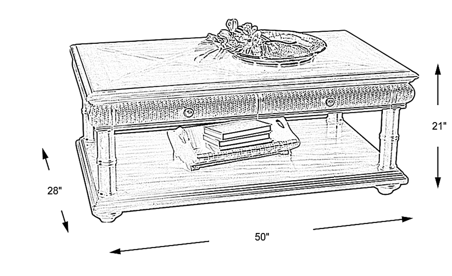 Invite the look and feel of the tropics when you welcome the Key West cocktail table into your home. The table is enhanced by rattan inlays and braided trim. Made of wood solids, it features a pine finish and veneers that form a subtle X pattern. Working drawers and a lower display shelf adds to the functional appeal.