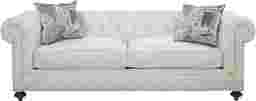 Sophisticated transitional design with a contemporary touch, the Knightsbridge sofa creates a plush seating area with an upscale look. Upholstered in plush woven ivory chenille fabric, this elegant sofa is accented with burnished nailhead trim and deep button tufting on the interior arms and back cushion. Lavishly rolled arms and chic turned legs add to the upscale look, while Feather Blend cobalt blue accent pillows add a contemporary update. 92% Polyester, 8% Linen.