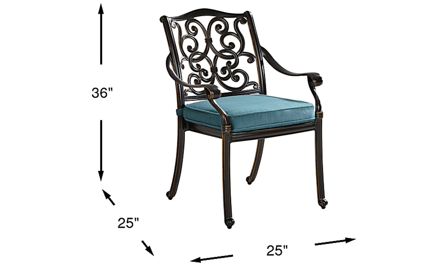 Graceful and elegant, the Lake Como outdoor arm chair is inspired by French Quarter architecture. Made with a premium solid cast 100% aluminum frame, the chair has a rust resistant all-weather powder coat finish with a hand applied antique bronze finished UV protected top-coat. It boasts a scrolled back design and curved arms along with a rivera-colored Inside Out performance fabric covered seat cushion.