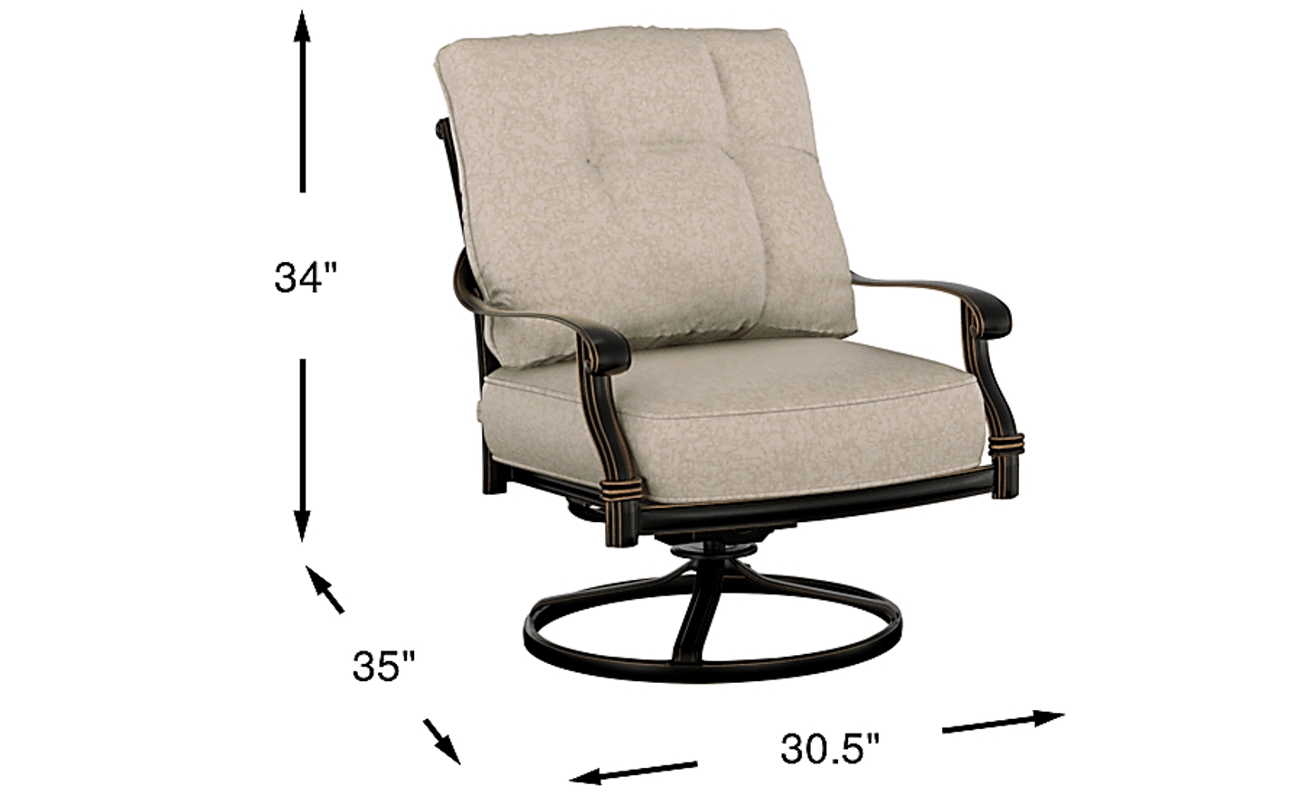 Combining elegance and comfort, the Lake Como swivel rocker chair is perfectly designed for outdoor dining areas. Made with a premium solid cast 100% aluminum frame, the chair has a rust resistant all-weather powder coat finish with a hand applied antique bronze finished UV protected top coat. It boasts a scrolled back design and curved arms along with a durable silk-colored Sunbrella performance fabric covered cushion. Swivel and rocking capabilities provide additional ways to unwind. 100% Sunbrella fabric. To clean Sunbrella fabric cushions remove dirt and spray on cleaning solution (water and mild soap), then use a soft bristle brush or sponge. Allow cleaning solution to soak into fabric and rinse thoroughly until soap residue is removed. Air dry. Do not dry clean.
