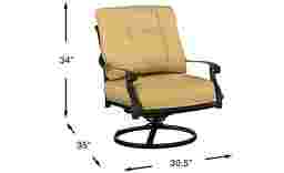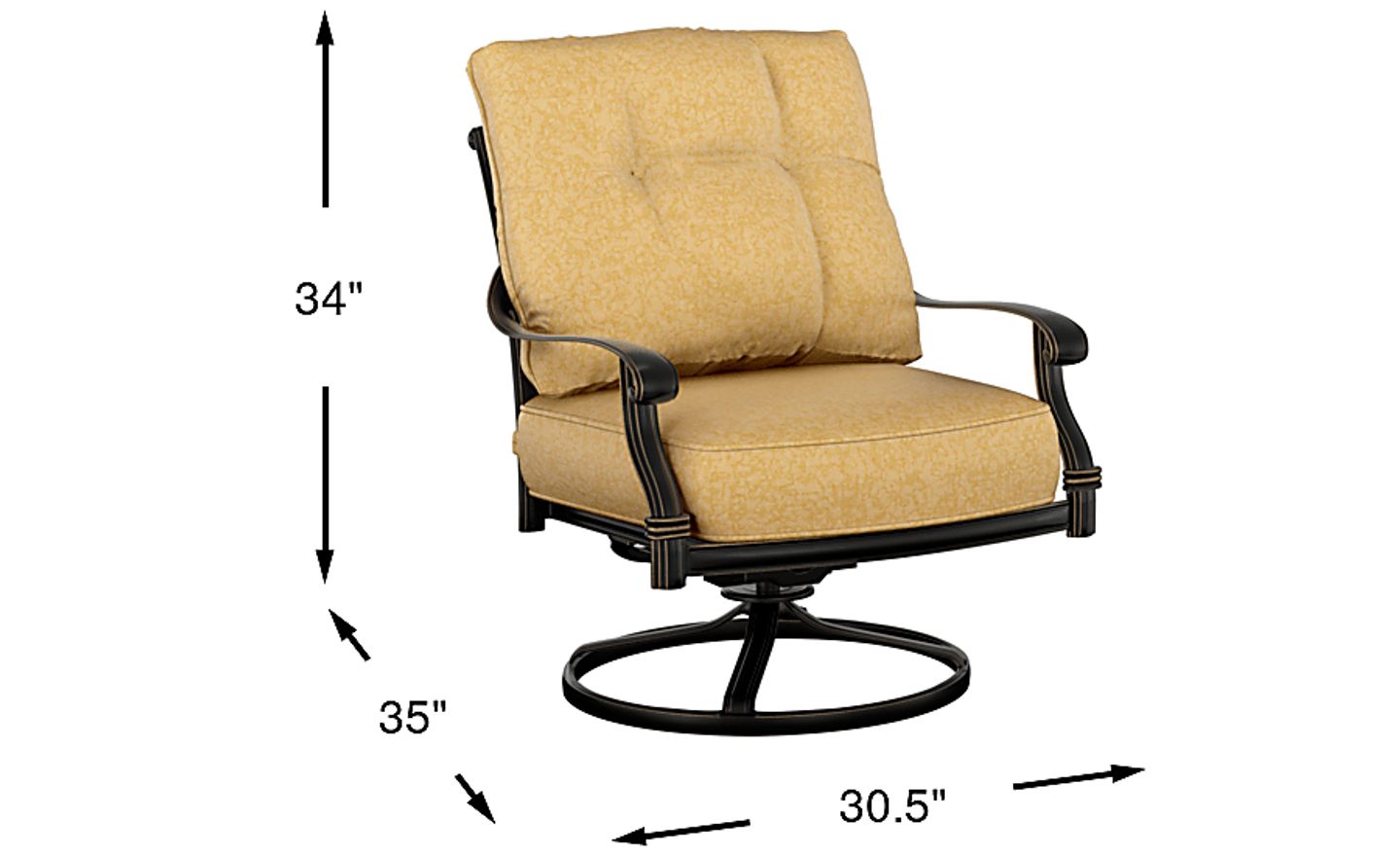 Combining elegance and comfort, the Lake Como swivel rocker chair is perfectly designed for outdoor dining areas. Made with a premium solid cast 100% aluminum frame, the chair has a rust resistant all-weather powder coat finish with a hand applied antique bronze finished UV protected top coat. It boasts a scrolled back design and curved arms along with a durable gold colored Sunbrella performance fabric covered cushion. Swivel and rocking capabilities provide additional ways to unwind. 100% Sunbrella fabric. To clean Sunbrella fabric cushions remove dirt and spray on cleaning solution (water and mild soap), then use a soft bristle brush or sponge. Allow cleaning solution to soak into fabric and rinse thoroughly until soap residue is removed. Air dry. Do not dry clean.