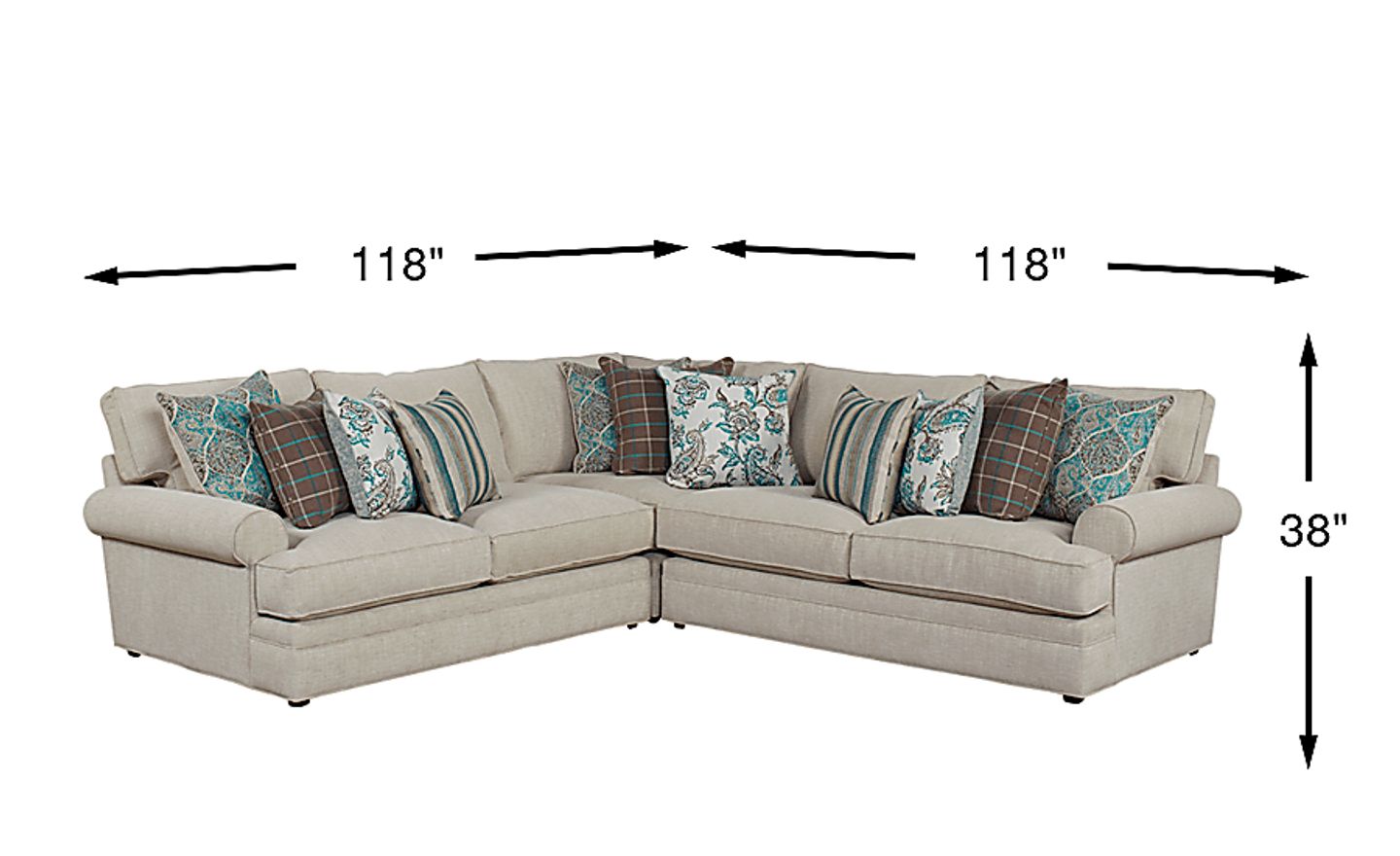 Unwind in style with the chic Lincoln Heights sectional, offering equal parts transitional design and luxurious comfort. Upholstered in soft textured woven fabric in a neutral beige color, this sectional features indulgently plush FeatherPlush seating with the enhanced comfort of memory foam technology. Each seat cushion is filled with a blend of feather, down, and conjugated polyester fiber. Double welted seat cushions offer a clean, tailored appearance, while roll arms contribute to the laidback feel. A mix of striped and patterned feather blend chenille accent pillows add an ample dose of personality. 100% Polyester.