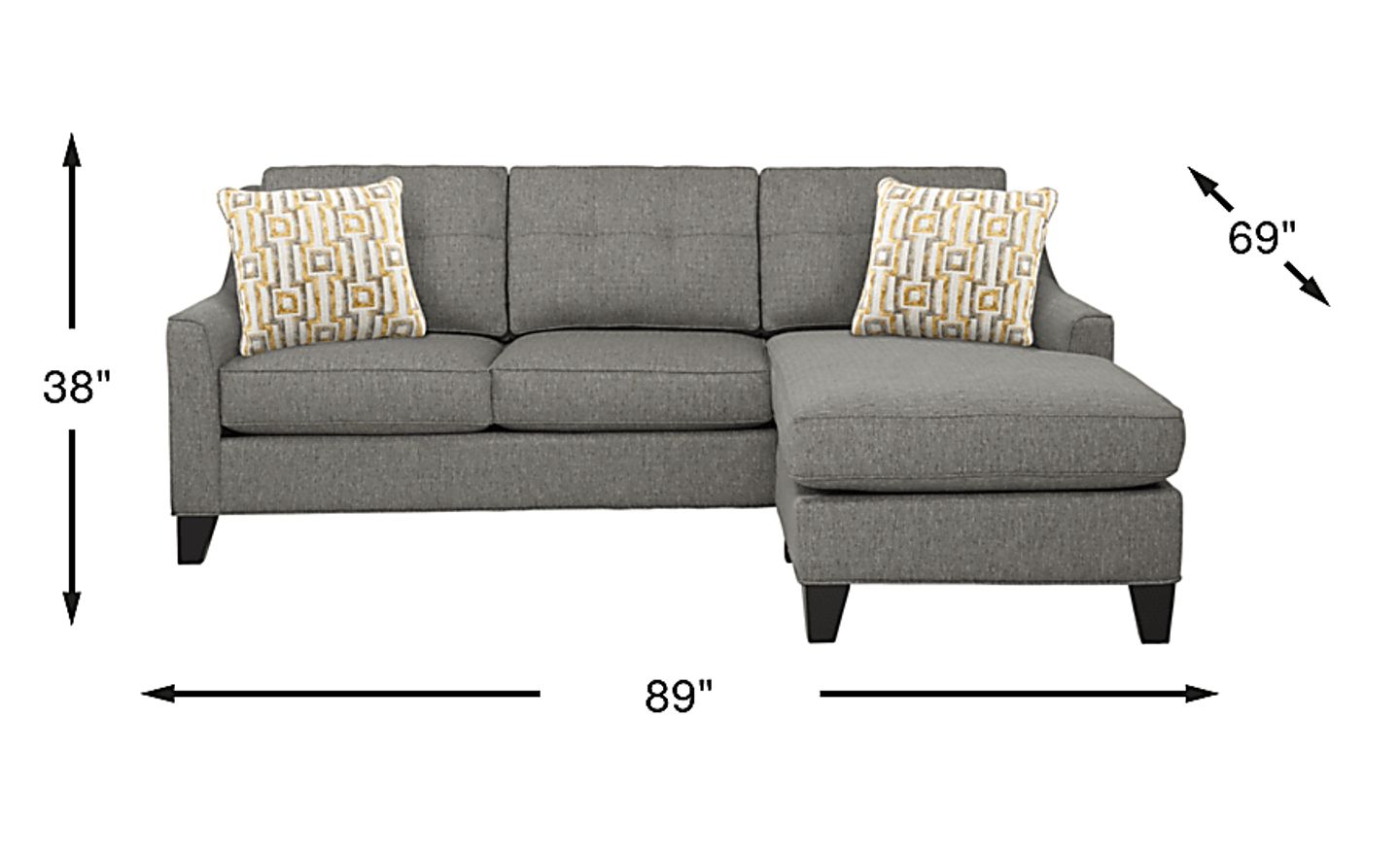 Contemporary and stylish, the Madison Place chaise sofa will transform your living room. Upholstered in thickly textured woven fabric, in a chic gray color, the chaise sofa features track arms and loose tufted pillowbacks. Elongated cushion and moveable base create a floating chaise, which can be used on either the right or the left. Decorative accent pillows in a geometric pattern add the final touch. 100% Polypropylene.