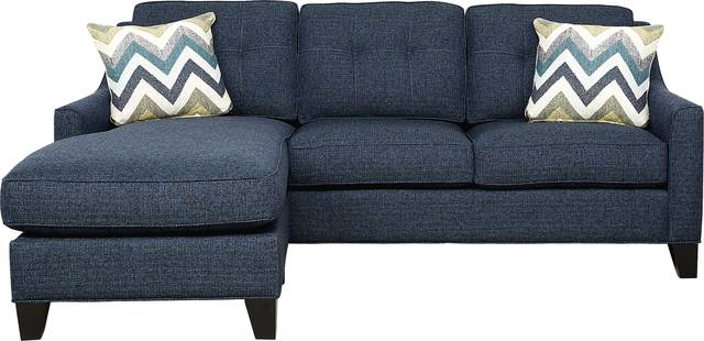 Contemporary and stylish, the Madison Place chaise sofa will transform your living room. Upholstered in thickly textured woven fabric, in a chic midnight blue color, the chaise sofa features a queen size sleeper with track arms and loose tufted pillowbacks. Elongated cushion and movable base create a floating chaise, which can be used on either the right or the left. Tucked away and easily pulled out for overnight guests, the sleeper boasts the exceptional comfort of a Sealy Royale queen size mattress with a quilted top. Decorative accent pillows in a geometric pattern add the final touch. 100% Polyester.