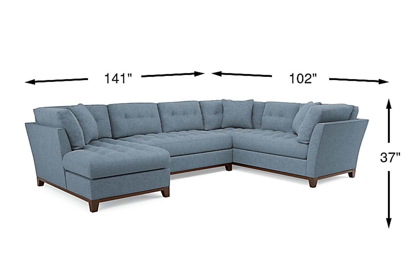 Bring versatile, stylish seating into your living room with the Metropolis Way sectional. Give the room a contemporary spin and separate the sectional's sofa from the chaise and armless loveseat for fresh seating options. Each piece is quality constructed on a hardwood frame for lasting wear and covered with textured fabric in chambray blue. Refined button tufting and a dark brown finished wood base complete each piece. Upholstery: 100% Polypropylene.