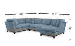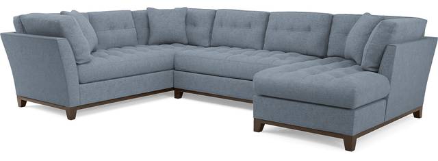 Bring versatile, stylish seating into your living room with the Metropolis Way sectional. Give the room a contemporary spin and separate the sectional's sofa from the chaise and armless loveseat for fresh seating options. Each piece is quality constructed on a hardwood frame for lasting wear and covered with textured fabric in chambray blue. Refined button tufting and a dark brown finished wood base complete each piece. Upholstery: 100% Polypropylene.