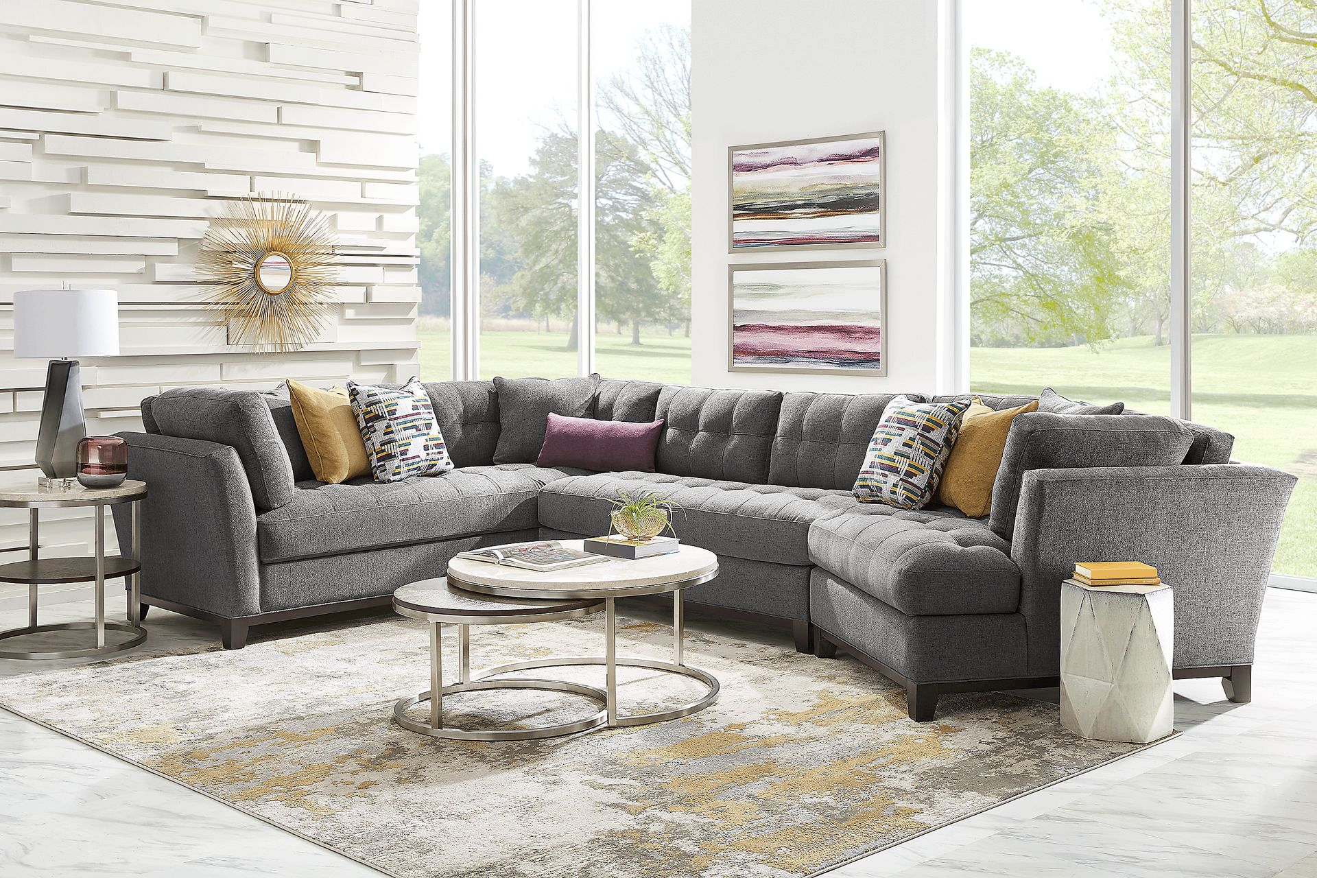 Bring versatile, stylish seating into your living room with the Metropolis Way sectional. Give the room a contemporary spin and separate the sectional's sofa from the cuddler and armless loveseat for fresh seating options. Each piece is quality constructed on a hardwood frame for lasting wear and covered with textured fabric in a charcoal color. Refined button tufting and a dark brown finished wood base complete each piece. Upholstery: 100% Polypropylene. Accent pillows sold separately.