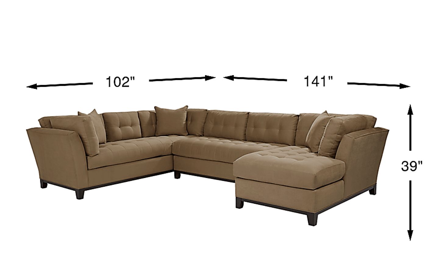 Bring versatile, stylish seating into your living room with the Metropolis Way sectional. Give the room a contemporary spin and separate the sectional's sofa from the chaise and armless loveseat for fresh seating options. Each piece is quality constructed on a hardwood frame for lasting wear, and covered with soft, easy care, Microfiber fabric in an attractive khaki color. Refined button tufting and a dark brown finished wood base complete each piece. 100% Polyester. Accent pillows sold separately.