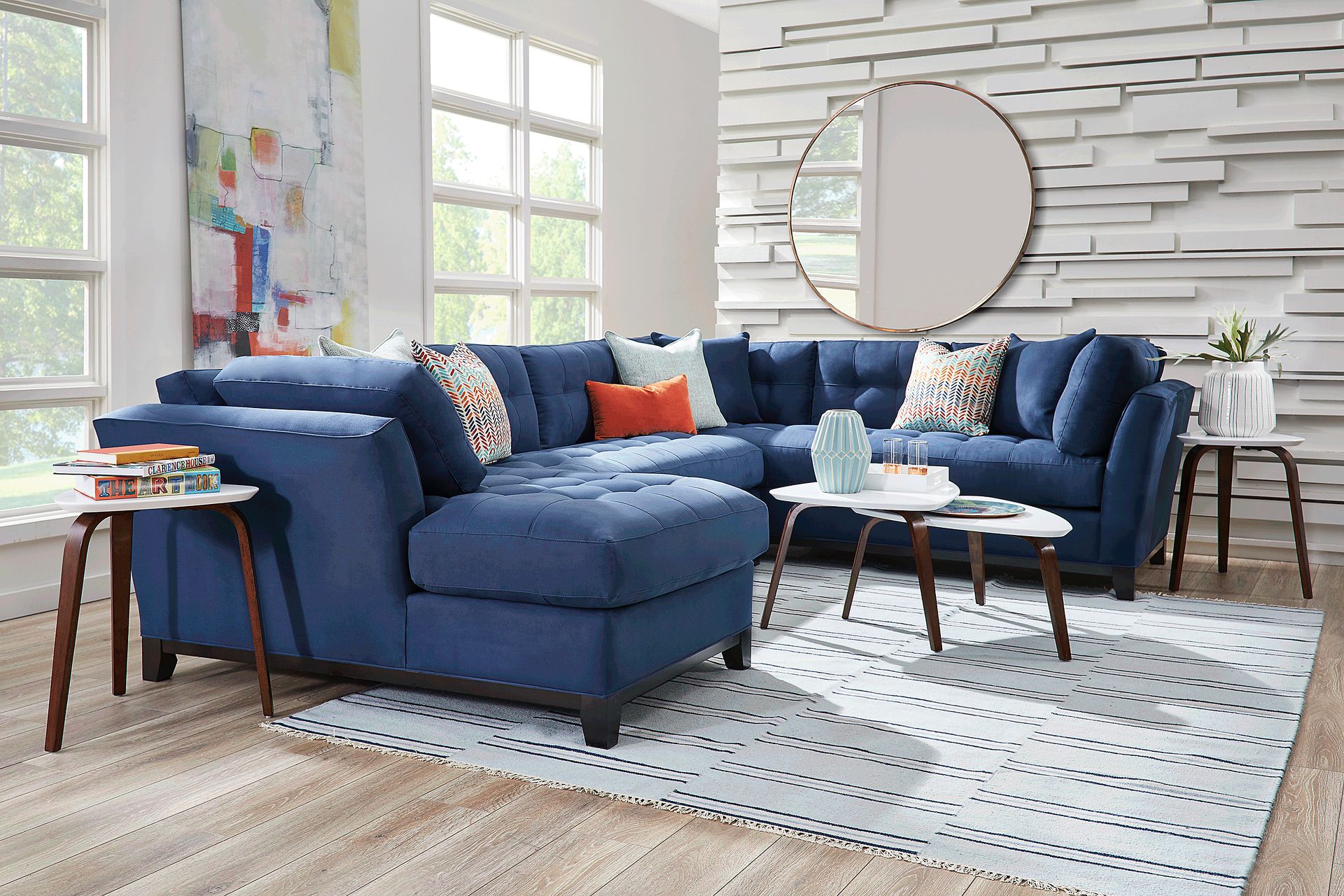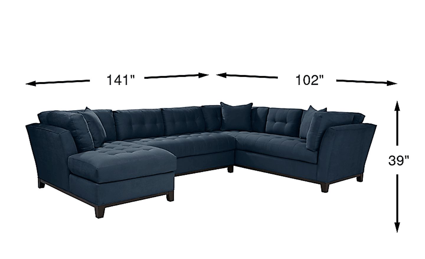 Bring versatile, stylish seating into your living room with the Metropolis Way sectional. Give the room a contemporary spin and separate the sectional's sofa from the chaise and armless loveseat for fresh seating options. Each piece is quality constructed on a hardwood frame for lasting wear, and covered with velvety soft, easy care, Microfiber fabric in an attractive sapphire color. Refined button tufting and a dark brown finished wood base complete each piece. 100% Polyester. Accent pillows sold separately.