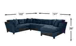Bring versatile, stylish seating into your living room with the Metropolis Way sectional. Give the room a contemporary spin and separate the sectional's sofa from the chaise and armless loveseat for fresh seating options. Each piece is quality constructed on a hardwood frame for lasting wear, and covered with soft, easy care, Microfiber fabric in an attractive sapphire color. Refined button tufting and a dark brown finished wood base complete each piece. 100% Poylester. Accent pillows sold separately.