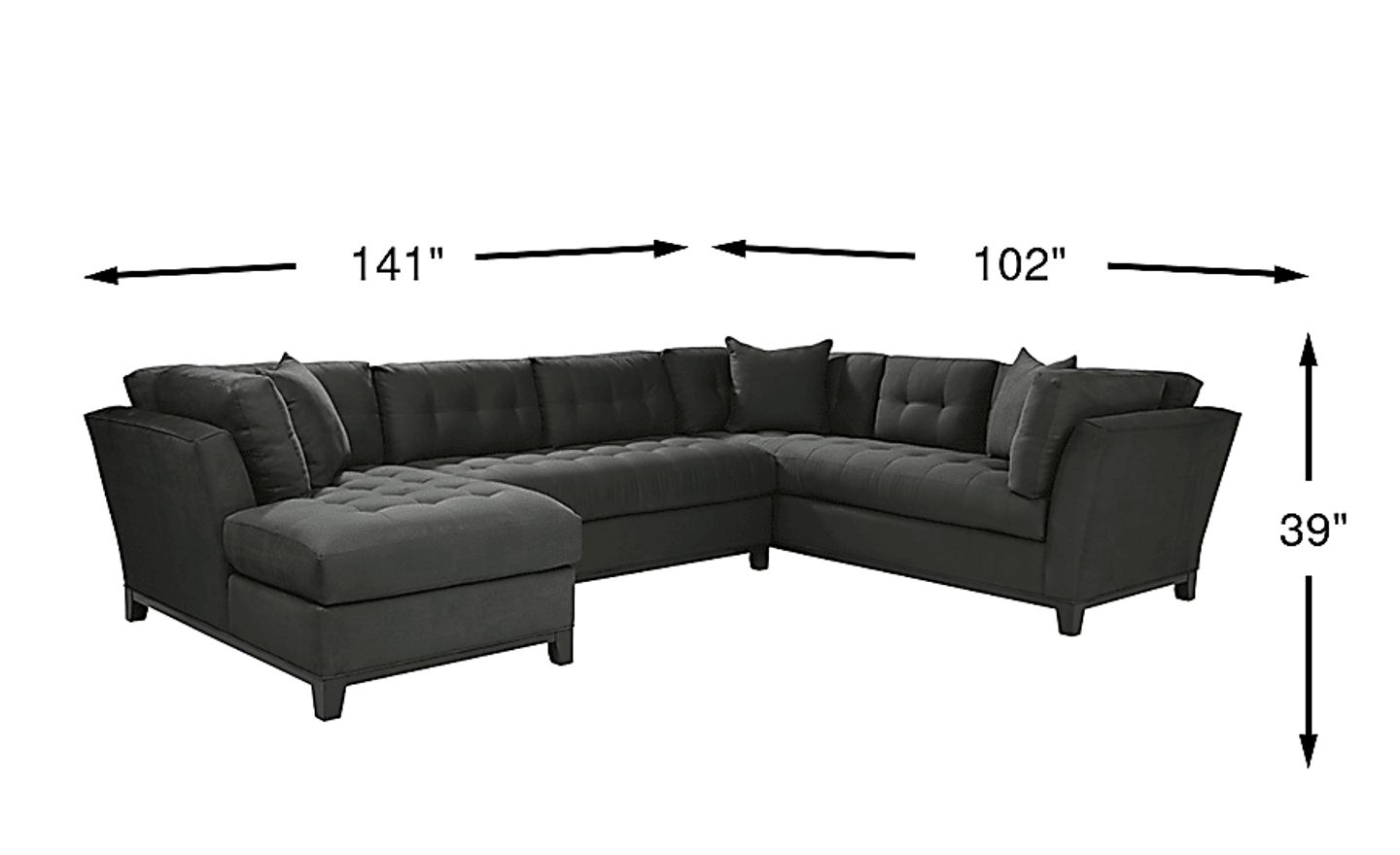 Bring versatile, stylish seating into your living room with the Metropolis Way sectional. Give the room a contemporary spin and separate the sectional's sofa from the chaise and armless loveseat for fresh seating options. Each piece is quality constructed on a hardwood frame for lasting wear, and covered with soft, easy care, Microfiber fabric in an attractive slate color. Refined button tufting and a dark brown finished wood base complete each piece. 100% Polyester. Accent pillows sold separately.