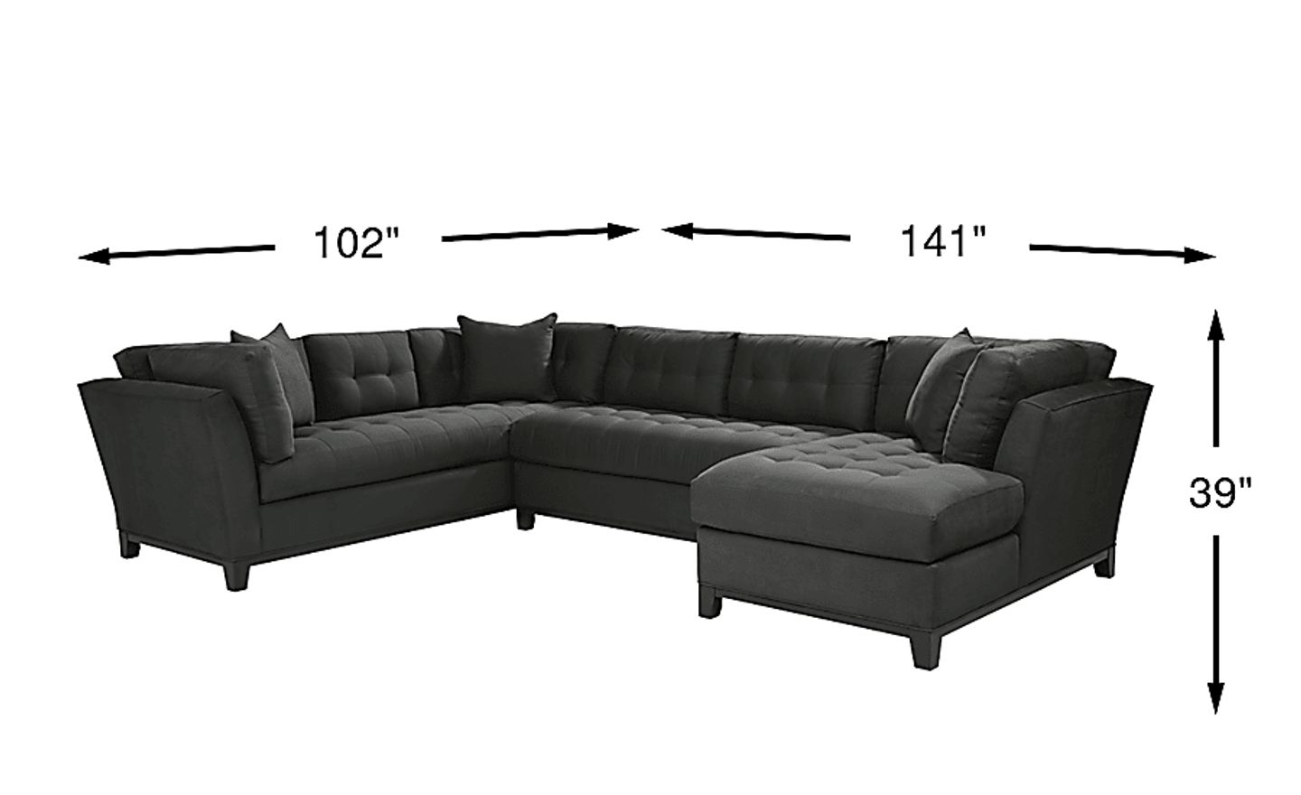 Bring versatile, stylish seating into your living room with the Metropolis Way sectional. Give the room a contemporary spin and separate the sectional's sofa from the chaise and armless loveseat for fresh seating options. Each piece is quality constructed on a hardwood frame for lasting wear, and covered with soft, easy care, Microfiber fabric in an attractive slate color. Refined button tufting and a dark brown finished wood base complete each piece. 100% Poylester. Accent pillows sold separately.