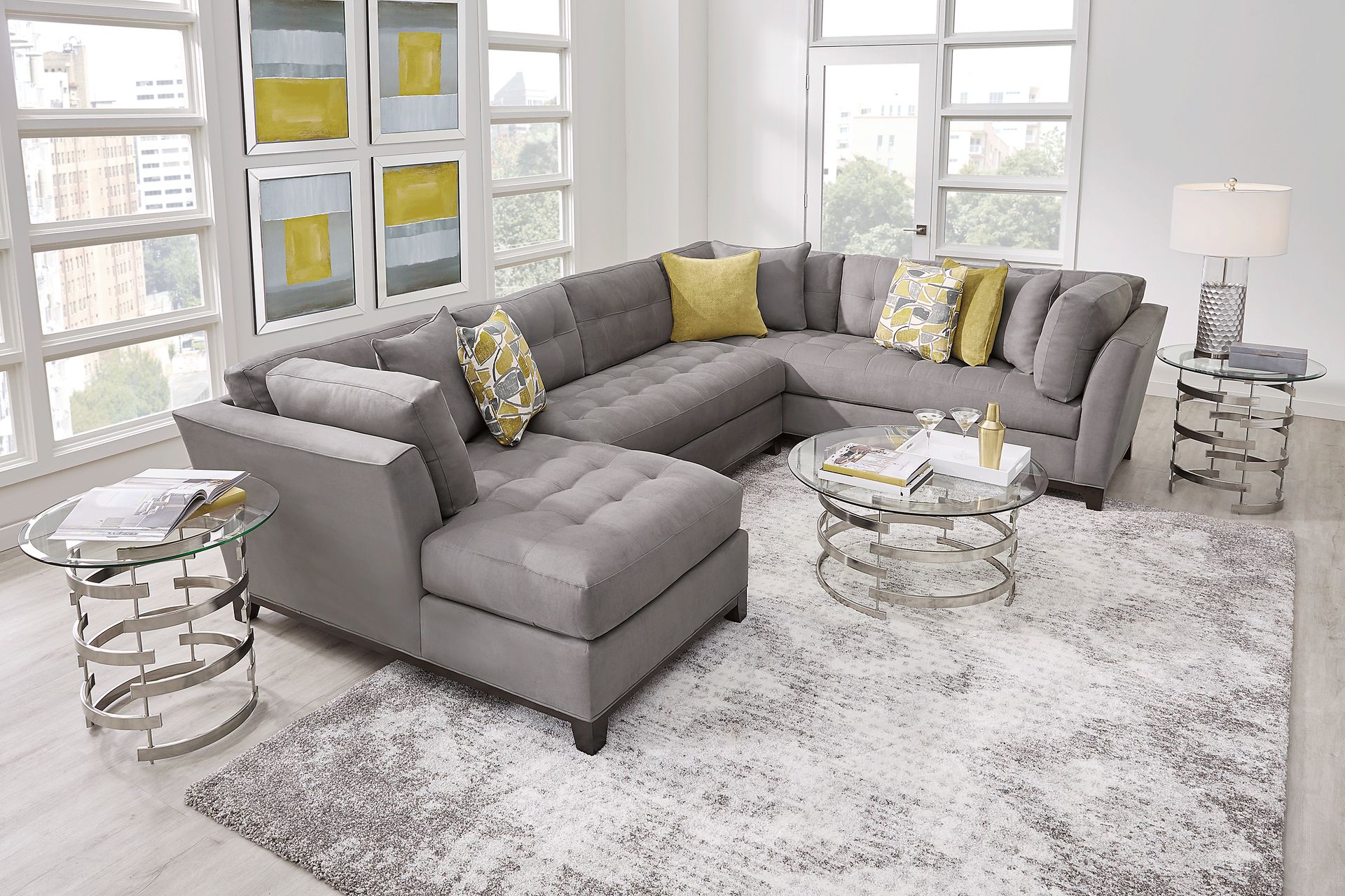 Bring versatile, stylish seating into your living room with the Metropolis Way sectional. Give the room a contemporary spin and separate the sectional's sofa from the chaise and armless loveseat for fresh seating options. Each piece is quality constructed on a hardwood frame for lasting wear, and covered with soft, easy care, Microfiber fabric in a neutral steel color. Refined button tufting and a dark brown finished wood base complete each piece. 100% Polyester. Accent pillows sold separately.