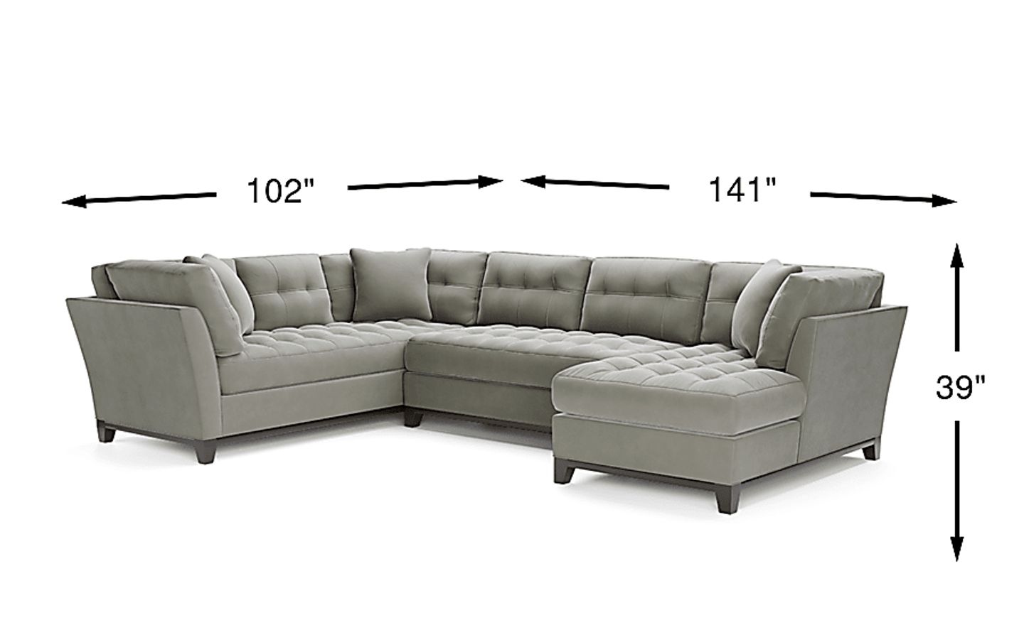 Bring versatile, stylish seating into your living room with the Metropolis Way sectional. Give the room a contemporary spin and separate the sectional's sofa from the chaise and armless loveseat for fresh seating options. Each piece is quality constructed on a hardwood frame for lasting wear, and covered with soft, easy care, Microfiber fabric in a neutral steel color. Refined button tufting and a dark brown finished wood base complete each piece. 100% Poylester. Accent pillows sold separately.