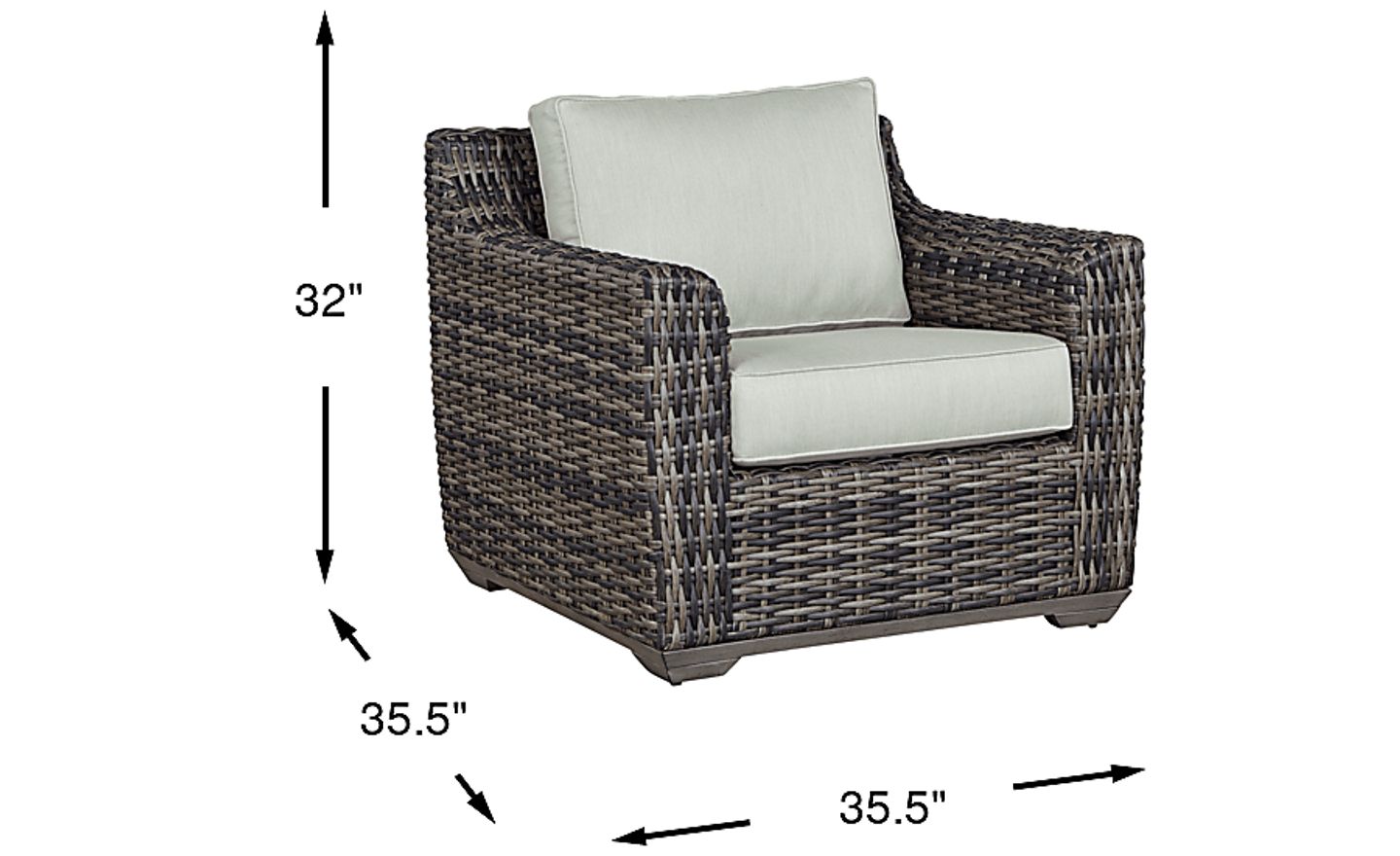Balancing beachside living with contemporary style, the Montecello chair offers a stylish solution for outdoor seating. All-weather handwoven wicker over a fully-welded rustproof aluminum frame is rendered in driftwood-inspired shades of gray, tan and brown. Each durable fabric covered cushion, in a mist color, is mold, mildew and fade resistant.