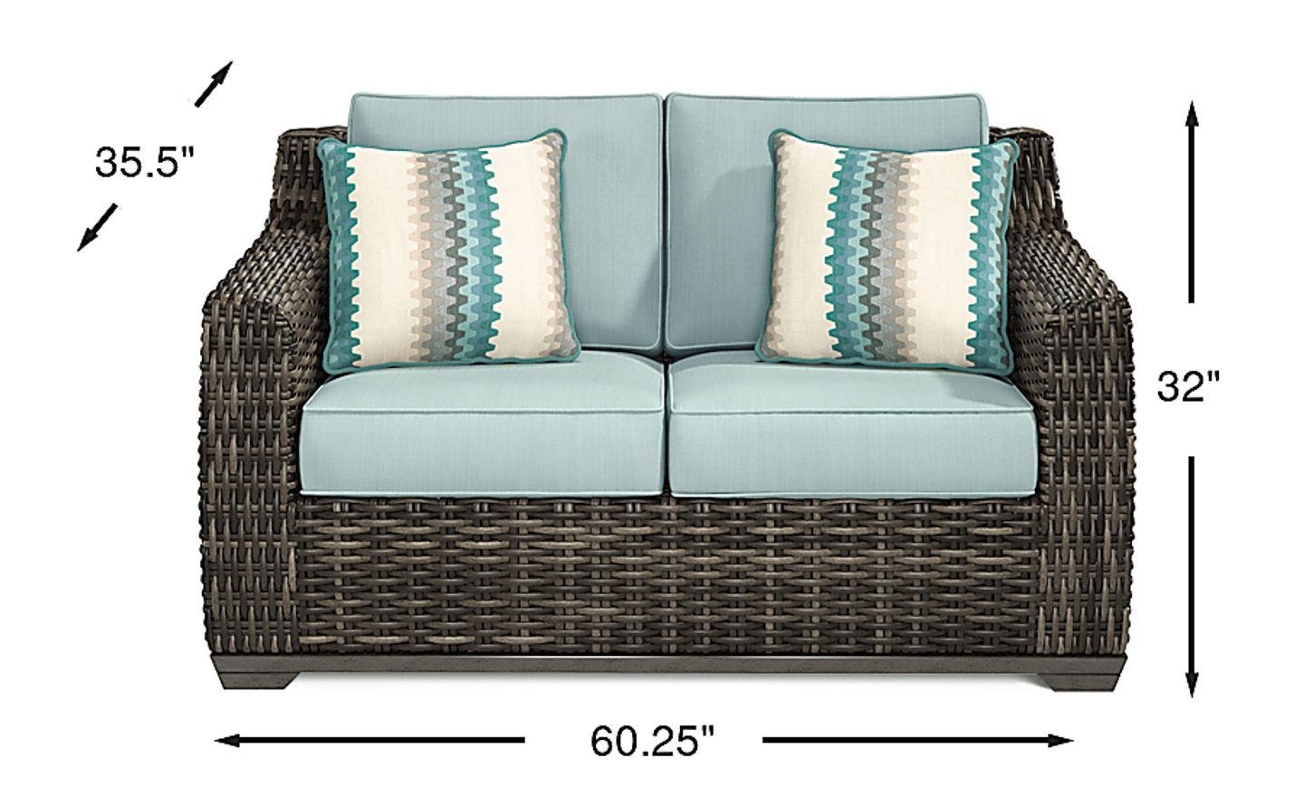 Casual beachside living meets contemporary style on the fabulous Montecello loveseat. This stylish seating for two is made with all-weather woven wicker in driftwood style shades of gray, tan and brown. Sunbrella fabric, known for its incredible durability, resists fading, mold and mildew to create long lasting and comfortable outdoor seating that can be enjoyed for many seasons to come. Patterned toss pillows provide decorative flair while complementing the mist color of the cushions. 100% Sunbrella fabric.