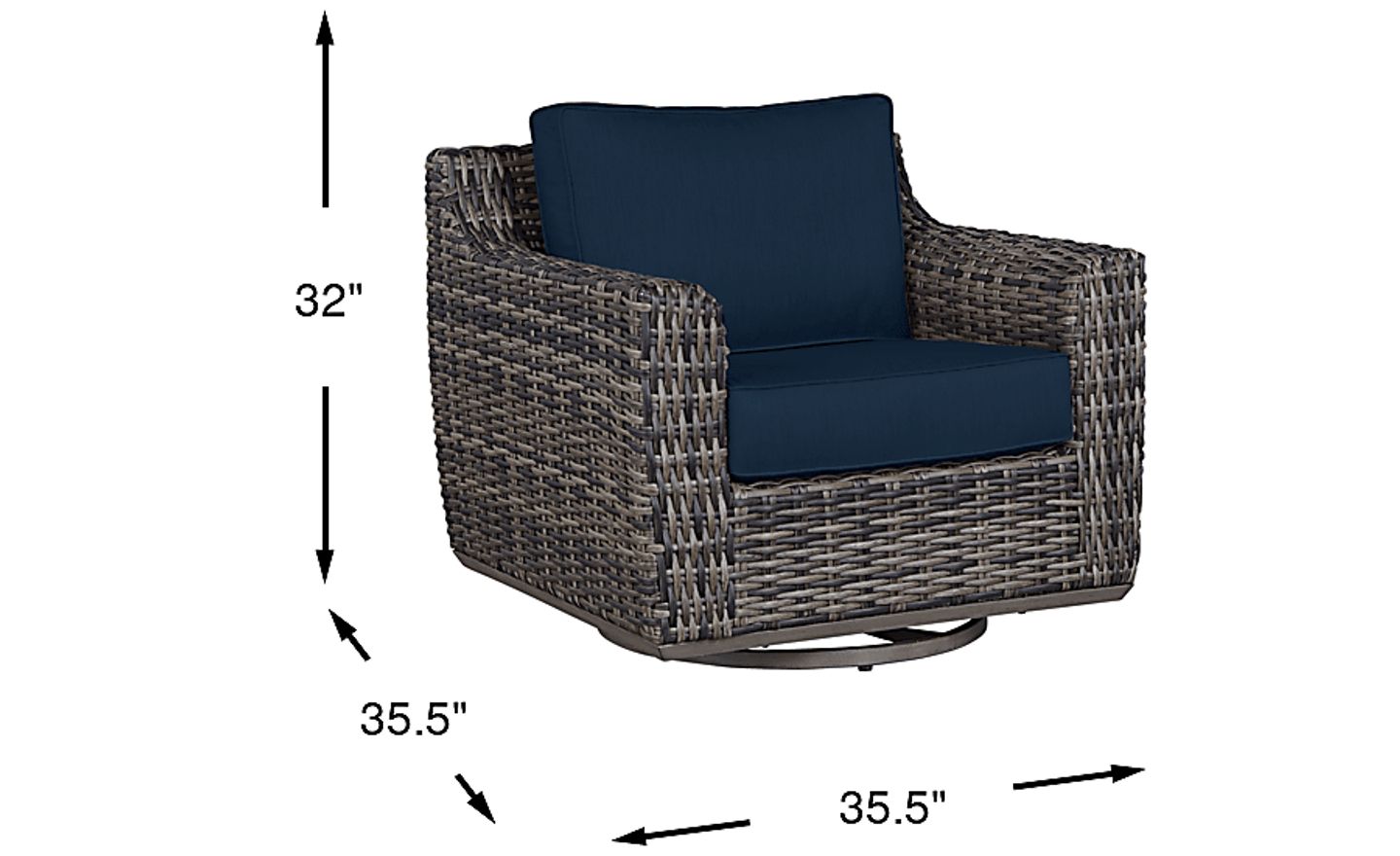 The Montecello swivel rocker chair blends casual beachside living and contemporary style. All-weather handwoven wicker over a fully-welded rustproof aluminum frame is rendered in driftwood-inspired shades of gray, tan and brown. Each durable fabric covered cushion, in an ink blue color, is mold, mildew and fade resistant. Swivel and rocking capabilities offer additional ways to take relaxation to the next level.