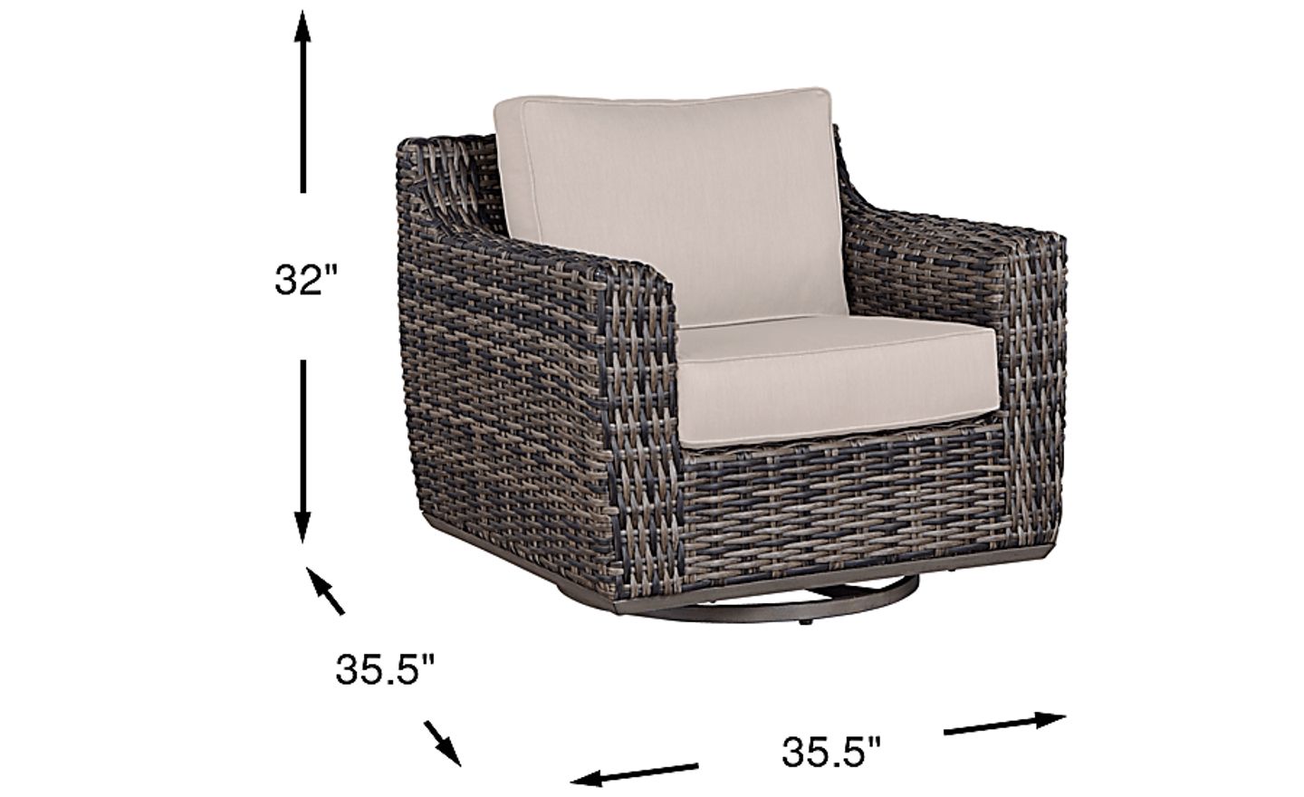 The Montecello swivel rocker chair blends casual beachside living and contemporary style. All-weather handwoven wicker over a fully-welded rustproof aluminum frame is rendered in driftwood-inspired shades of gray, tan and brown. Each durable fabric covered cushion, in a linen color, is mold, mildew and fade resistant. Swivel and rocking capabilities offer additional ways to take relaxation to the next level.