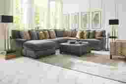 Relaxed contemporary styling and luxurious seating for up to six people make the Palm Springs chaise sectional an exceptional choice. Its deep seating comfort with unbelievable softness and conformity is achieved with feather blend cushions that provide a sumptuous, enveloping feel. Each seat cushion features a plush custom blend of feathers, fiber and down surrounding a supportive foam core for comfort that’s soft yet structured. Natural elements offer spring-like support and resiliency with form and softness. Plush woven upholstery has a lavish feel and on-trend silver color. Soft to the touch, this fabric is also durable enough for a busy family room. Upholstery: 100% Polyester