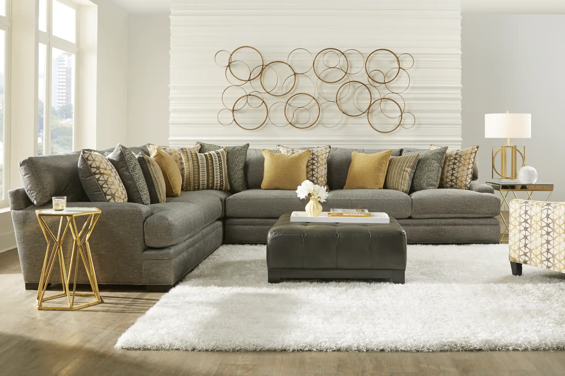Relaxed contemporary styling and luxurious seating for up to six people make the Palm Springs sectional an exceptional choice. Its deep seating comfort with its unbelievable softness and conformity is achieved with feather blend cushions that provide a sumptuous, enveloping feel. Each seat cushion features a plush custom blend of feathers, fiber and down surrounding a supportive foam core for comfort that’s soft yet structured. Natural elements offer spring-like support and resiliency with form and softness. Plush woven upholstery has a lavish feel and on-trend silver color. Soft to the touch, this fabric is also durable enough for a busy family room. 100% Polyester