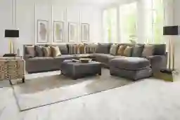 Yes, this sectional is upholstered in 100% polyester, a material highly regarded for its resilience and ease of maintenance. The plush woven upholstery provides a luxurious, soft-to-the-touch feel while maintaining the durability necessary for high-traffic family rooms. Based on our material expertise, polyester is resistant to stretching and shrinking, helping the silver fabric retain its tailored look even with frequent use.