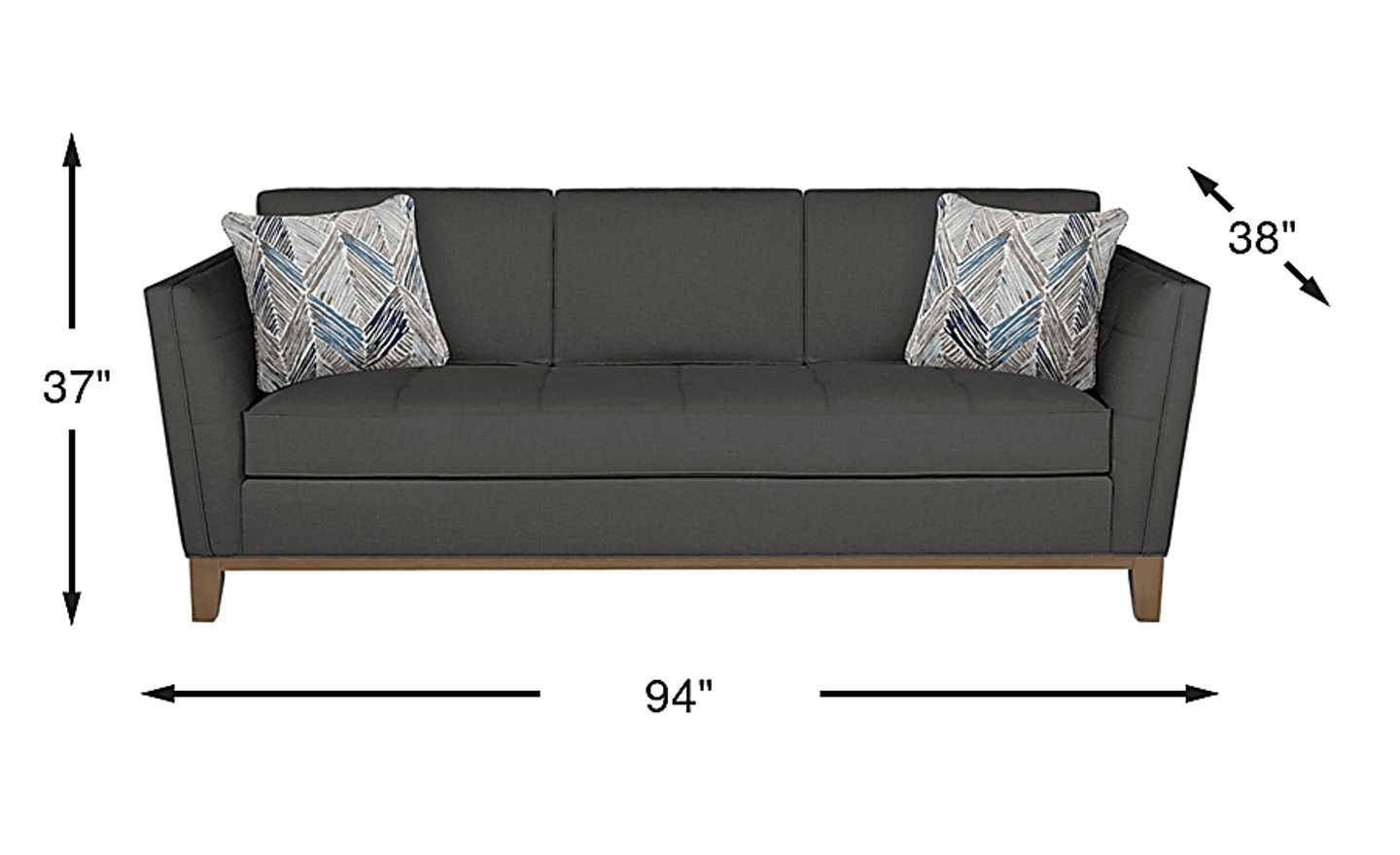 The fashion-forward Park Boulevard sofa sets the tone for chic contemporary living you'll love coming home to. Characterized by a sleek silhouette and tufted detailing, the sofa is set on a slender wood base with slim angled legs in an ash brown finish. More than just a showpiece, the sofa is sumptuous too thanks to the soft linen-like woven fabric in an on trend gray color. Toss pillows in a designer style arrow pattern lend the perfect finishing touch. 100% Polyester. Shown with Arrow Winter accent pillows.