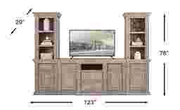 The Pine Manor wall unit from the Cindy Crawford Home collection exudes style and superior craftsmanship. It features a construction of solid Brazilian pine in a washed brown finish that delivers styling versatility, as well as six drawers, four cupboards and seven open shelves for storing or displaying your living room essentials. Its 65-inch TV opening creates the ideal way to enjoy a movie, and its traditional design brings an element of sophistication to any space.