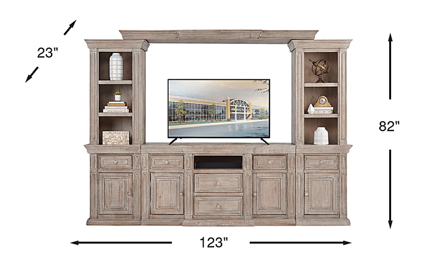 The Pine Manor wall unit from the Cindy Crawford Home collection exudes style and superior craftsmanship. It features a construction of solid Brazilian pine in a washed brown finish that delivers styling versatility, as well as six drawers, four cupboards and seven open shelves for storing or displaying your living room essentials. Its 65-inch TV opening creates the ideal way to enjoy a movie, and its traditional design brings an element of sophistication to any space.