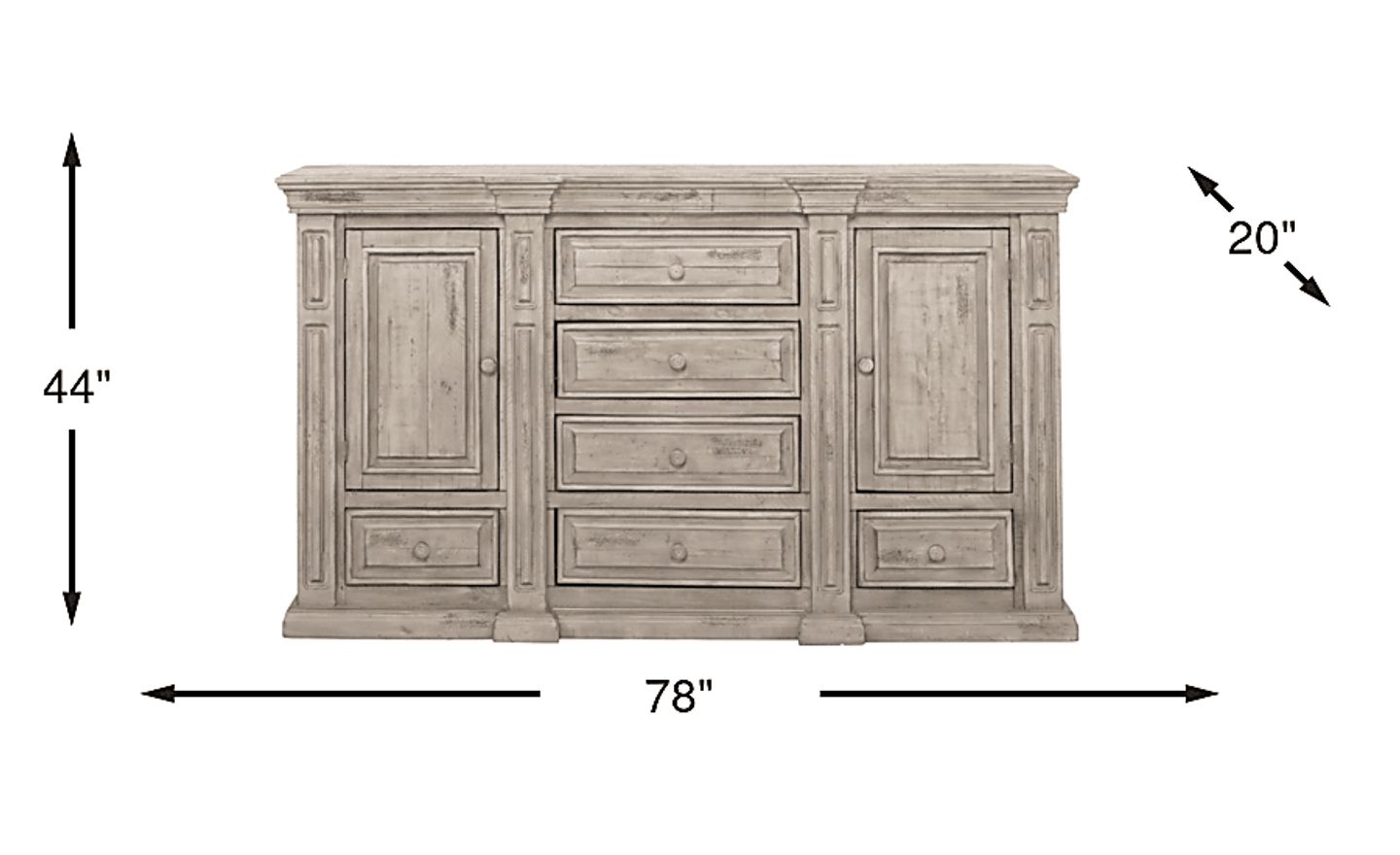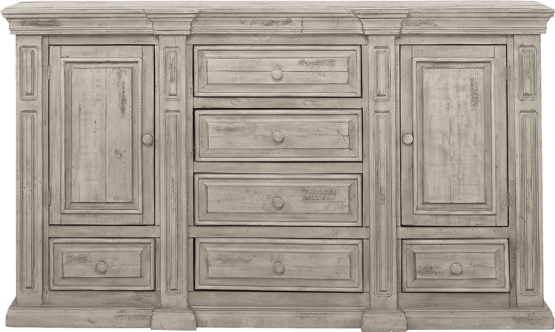 Offering an elegant and stately place for clothes storage, the Pine Manor dresser has a traditional style that sets it apart. Well-crafted with solid Brazilian pine in a gray finish, six drawers and two doors are complemented with matching wood hardware for a polished look.