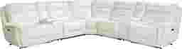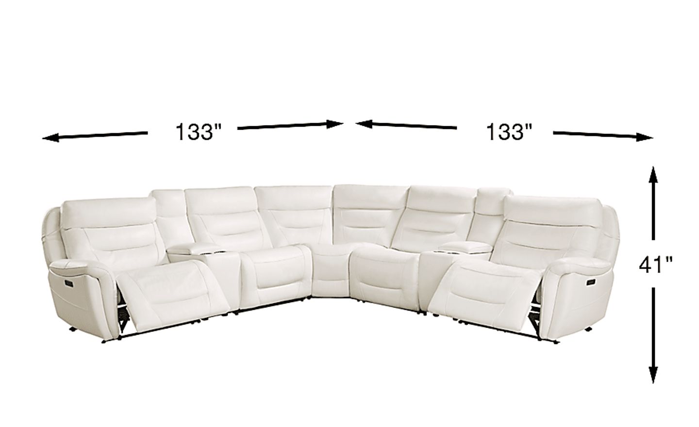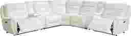 Command a striking style profile with the Regis Park power reclining sectional from the Cindy Crawford Home collection. Upholstered in rich white leather with padded outside arms, a tall back and inset piping, this grand sectional's sophisticated flare is matched only by the luxury of its featured amenities. Dual power head and footrests recline with the press of a button while built-in USB ports provide seamless accessibility for charging your favorite devices. You can even keep a beverage handy with removable, full-size stainless-steel cup holders. A pair of corresponding storage consoles set the scene and give you a taste of Regis Park luxury. Upholstery: Top grain leather where the body touches. Vinyl back and sides. Accent pillows not included.