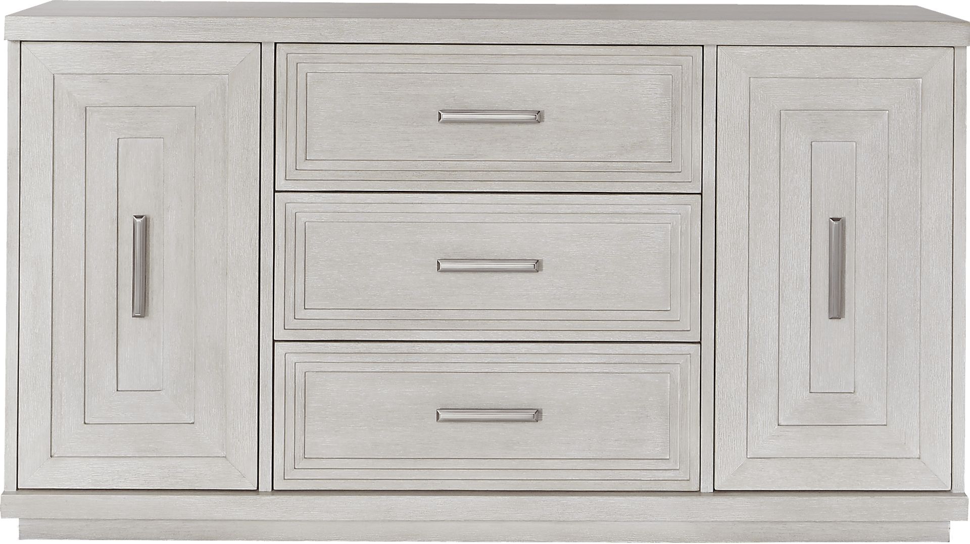 The neutral tones and geometric design of the Royal Park buffet create a warm sophistication for all of your mealtime get-togethers. Casually contemporary in style and finished in a beautiful ivory hue, this piece features three drawers with dustproof bottoms, English dovetail joints and ball bearing glides for support and longevity while a door on each side includes two adjustable shelves for optimal storage space and convenience.