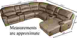 With the San Marco sectional you don't have to sacrifice style for comfort. Luxurious rich toffee color leather where the body touches lends a supple feel with wonderful natural grain detail; double stitching provides durability. Deep seated cushions with convenient concealable cup holders make this a supremely comfortable sectional. The fully padded outside backs and sides create a crisp tailored look. Modular flexibility allows you to choose the configuration that works best for your room. Cindy Crawford Home San Marco Toffee Leather Match 7 Pc Sectional See additional image for sectional dimensions. Includes LAF Power Recliner, Armless Recliner, Wedge, Armless Chair, 2 Consoles, RAF Pushback Chaise