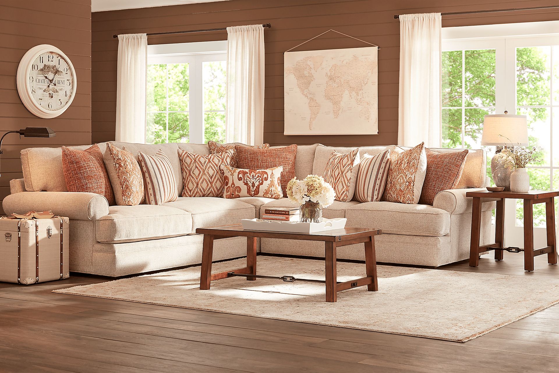 Introduce your home to the cozy comfort of the Scottsdale Square sectional from the Cindy Crawford Home collection. Upholstered in knitted fabric, this piece features surplus space and style. FeatherBlend seat cushions and pillows grant easy relaxation as large back cushions ensure comfy support. Traditional padded roll arms lend a classic look while welted detailing adds texture. Multicolored accent pillows in warm hues of orange and beige enhance the transitional style. Upholstery: 100% POLYESTER