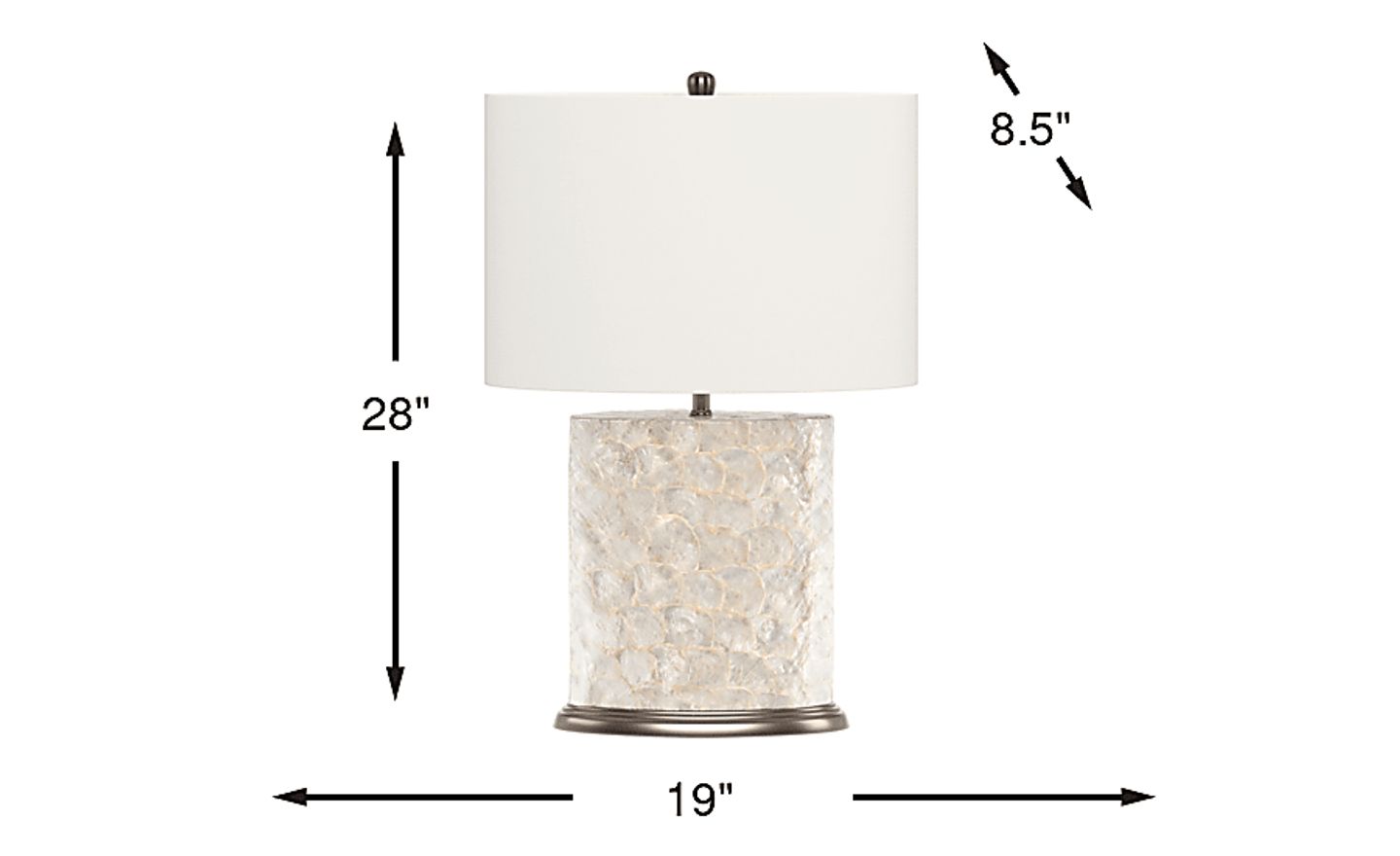 Distinctive lighting is yours with the Shell lamp from Cindy Crawford Home. The base is made of beautiful capiz shell. An oval nickel plated base complements the body's delicate pearlescent color. The oval shade is rendered in a crisp white linen tone. For versatility the lamp has a 3 way switch and accommodates up to a 150 watt bulb.