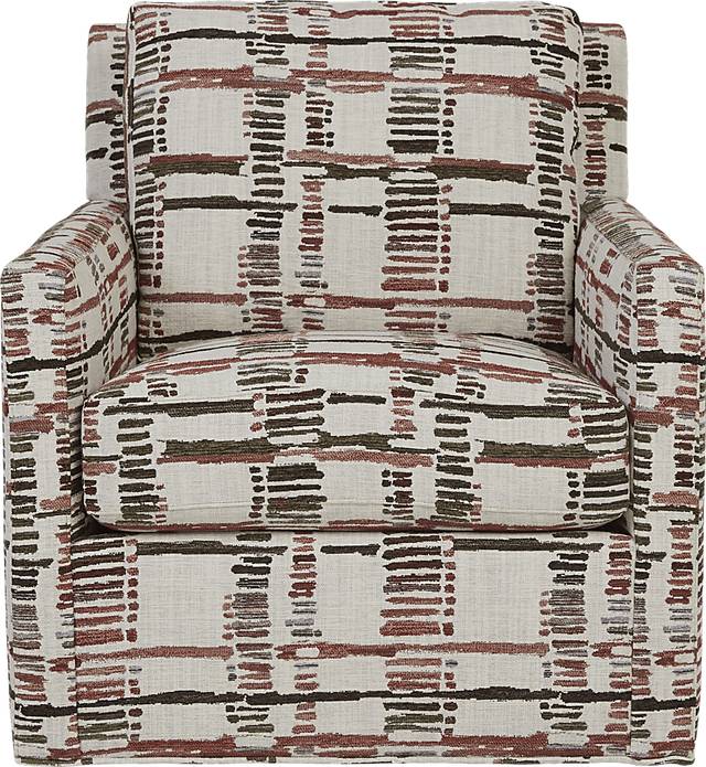Unwind in transitional style with the Tribeca Loft swivel chair from Cindy Crawford Home. This piece's beige upholstery with a geometric maroon and green pattern adds chic appeal to any space. Sleek track arms add an elegant finishing touch. 100% Polyester.