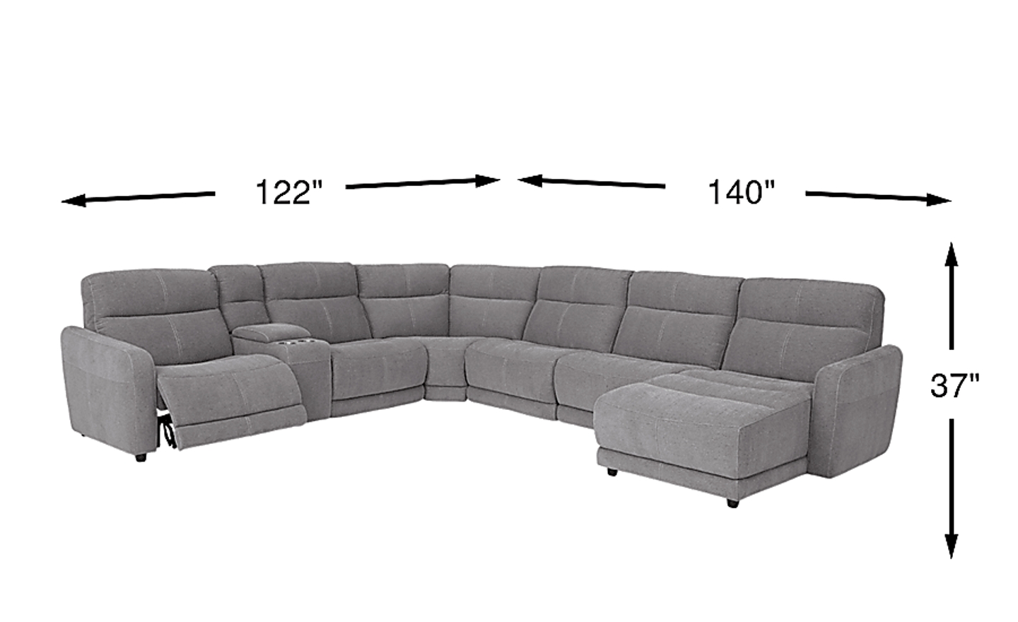 Contemporary design meets modern convenience with the West Highlands power reclining sectional. Upholstered with textured fabric in gray, it hosts a clean look that brings ease and comfort to your busy lifestyle. Seating up to six people, this sectional features channel back cushions and padded chaise footrests with a power reclining feature that allows you to raise and lower footrests at the touch of a button. Brown tapered legs and power reclining buttons hidden inside the arms give this sectional a sleek stationary appearance. Subtle details add to this collection, including comfy bucket style seating and curved track arms. The lift-top storage console has two removable cupholders and a built-in USB port to keep your electronics charged. Two power recliners and a chaise on one end offer comfort for the entire family. 22" extension when footrest is fully reclined. Allow 4" for wall spacing. 100% Polyester