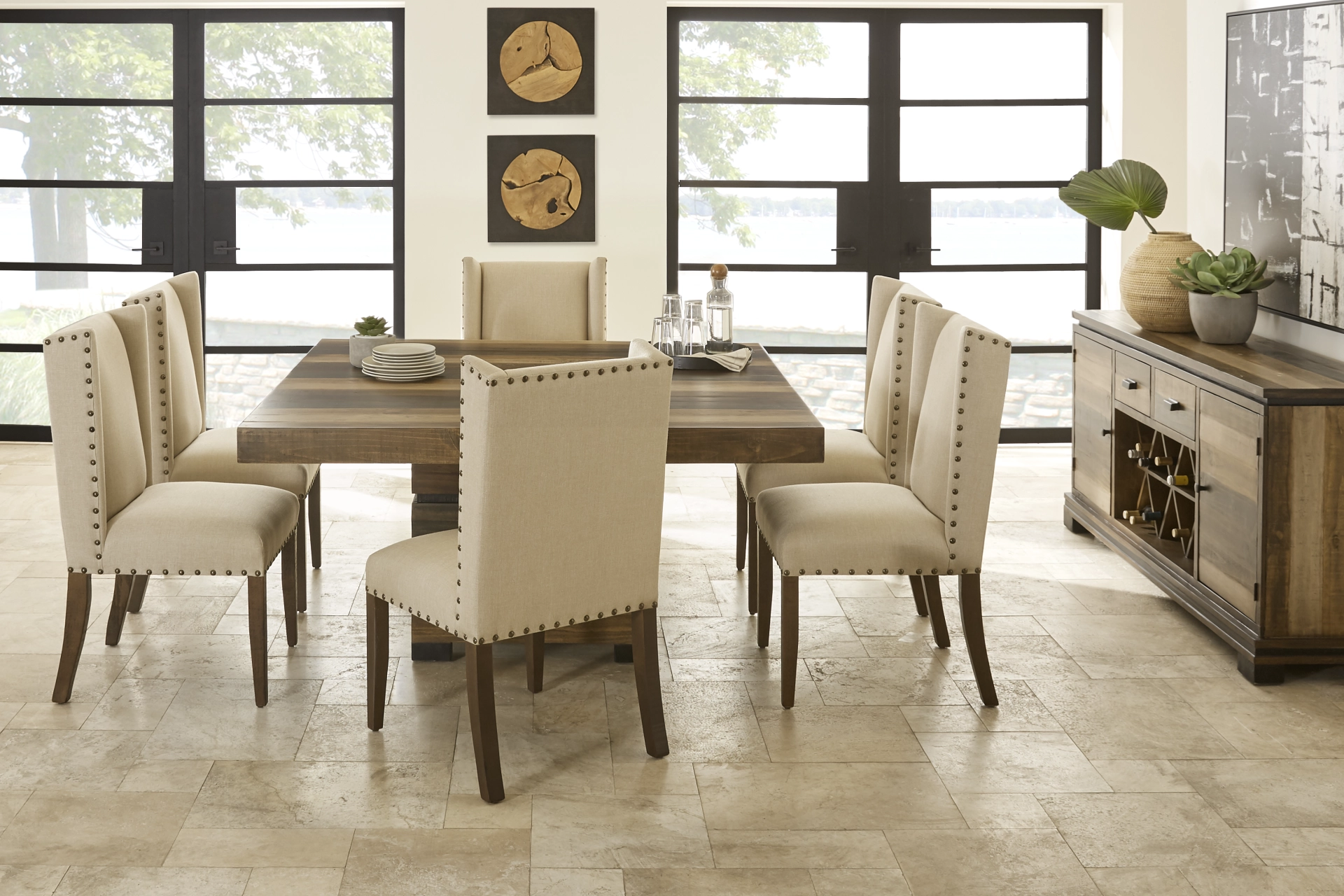 Serve up stylish meals with the Westover Hills dining room. It offers a contemporary aesthetic with warm rustic touches, lending itself in both industrial lofts and modern homes. Crafted from solid pine wood, the table features a slat-lined top and pedestal base with exposed knots and natural distressing details. An inviting combination of light and dark brown tones are striated along the table's square slat surface and pedestal base, creating a distinctive look. Each side chair features neutral upholstery accented by nailhead trim.