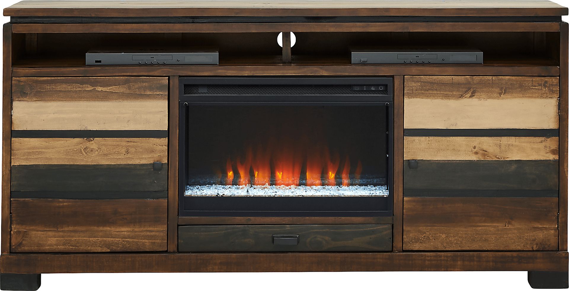 Boasting rustic contemporary style, the Westover Hills console is a practical and stylish storage solution for your living room. Perfect for your TV and entertainment accessories, this piece is crafted of Brazilian pine in a beautiful brown finish. For cozy nights at home, this wall unit also features a crystal-style firebox. Two side doors combine with a middle drawer to offer plenty of concealed storage. Plus, helping you stay organized are two small shelves in the center. An additional shelf extends along the top, just underneath the surface, providing a handy spot to place consoles and more. Designed with convenience in mind, a hole for cable management makes it easy to plug in electronic devices and complete your setup.