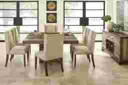Make a statement at your dining table with the Westover Hills side chair. Stylish at any angle, neutral upholstery is accented by nailhead trim. The legs are crafted from solid pine wood in a brown finish, making it an excellent example of contemporary-meets-rustic styling.