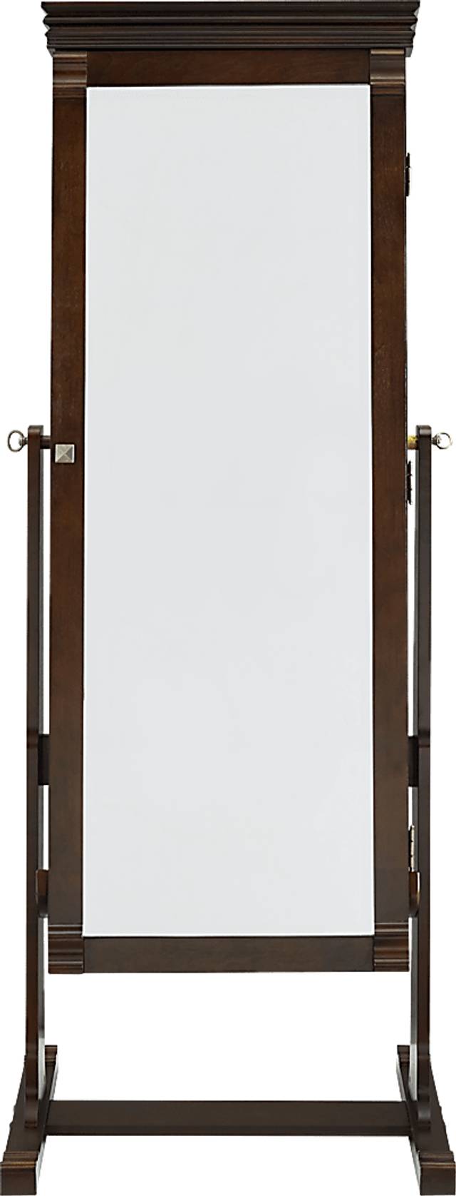 This Clagett mirror is a timeless addition to a bedroom or dressing area. The mirror can easily be angled to suit you. Once open, multiple hooks, shelves, pockets and ring pads provide ample storage for all of your jewelry pieces. Black felt lining makes sure all of your pieces are protected. Finished in a rich walnut, the front of the mirror is accented with a small square silver pull and decorative trim. Customer assembly is required.