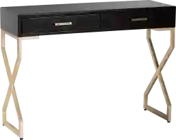 A stunning fusion of faux leather and metal make the Clairewood console table a unique addition to any space. This console is upholstered in dark brown cracked faux leather for rugged charm. Two spacious drawers provide room to store phone chargers, bills, and more. A sturdy black glass tabletop is equipped with space to display books, decor, and more. The console is supported by a glamorous gold-finished metal frame that contrasts with the aged faux leather for a cool, contemporary feel. Inspired by both modern and ancient design, the Clairewood features gold-finished drawer handles embellished with the archaic Greek key motif. Place this exceptional piece in the foyer to create an impressive entrance, or place it in the living room to form a striking focal point. Customer assembly is required.