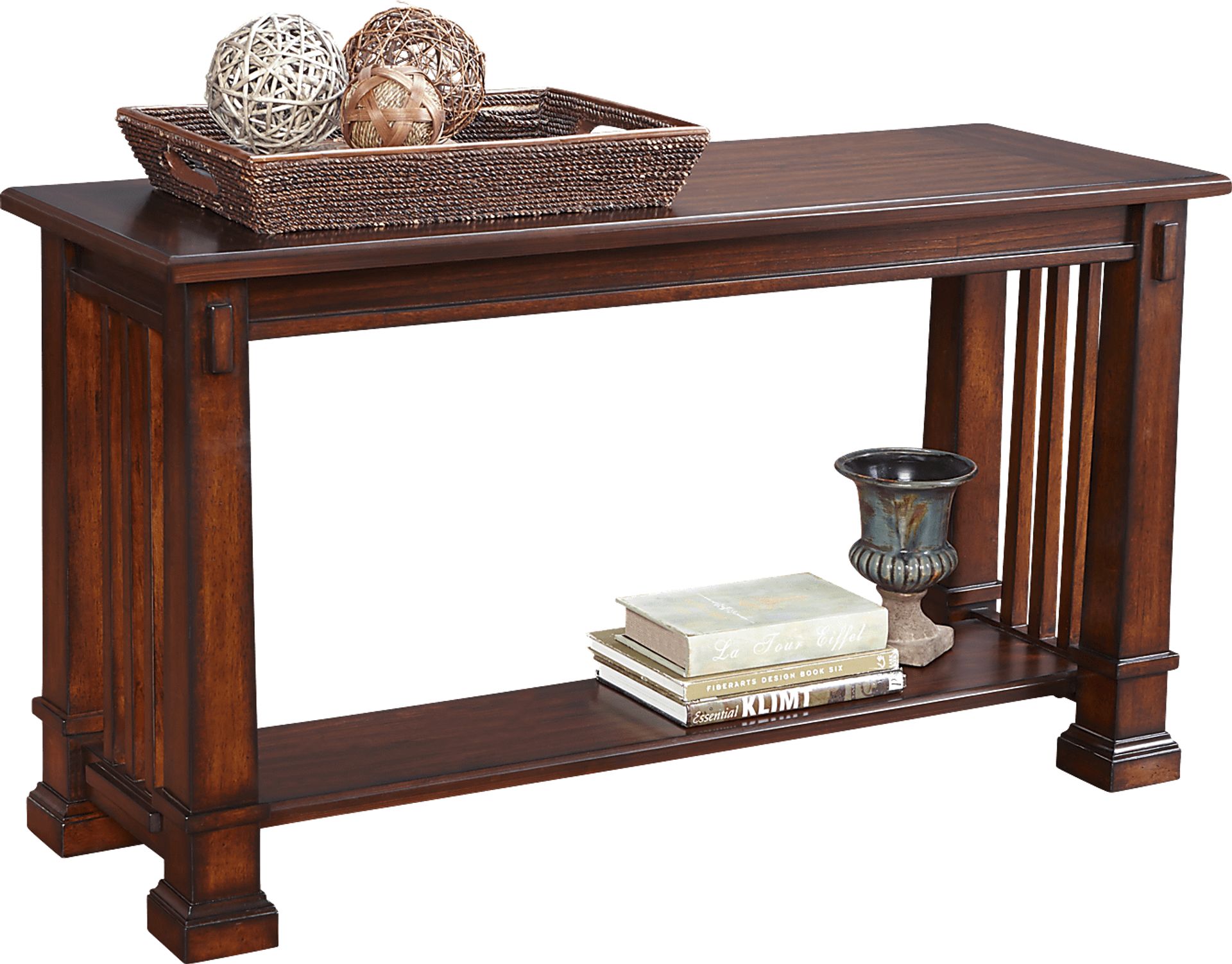 With its sophisticated styling and traditional design, the Clairfield sofa table creates a cozy casual feel in your living space. Crafted of wood products and acacia veneers in a warm honey brown finish, this classic table features slat detailing for a rustic touch.