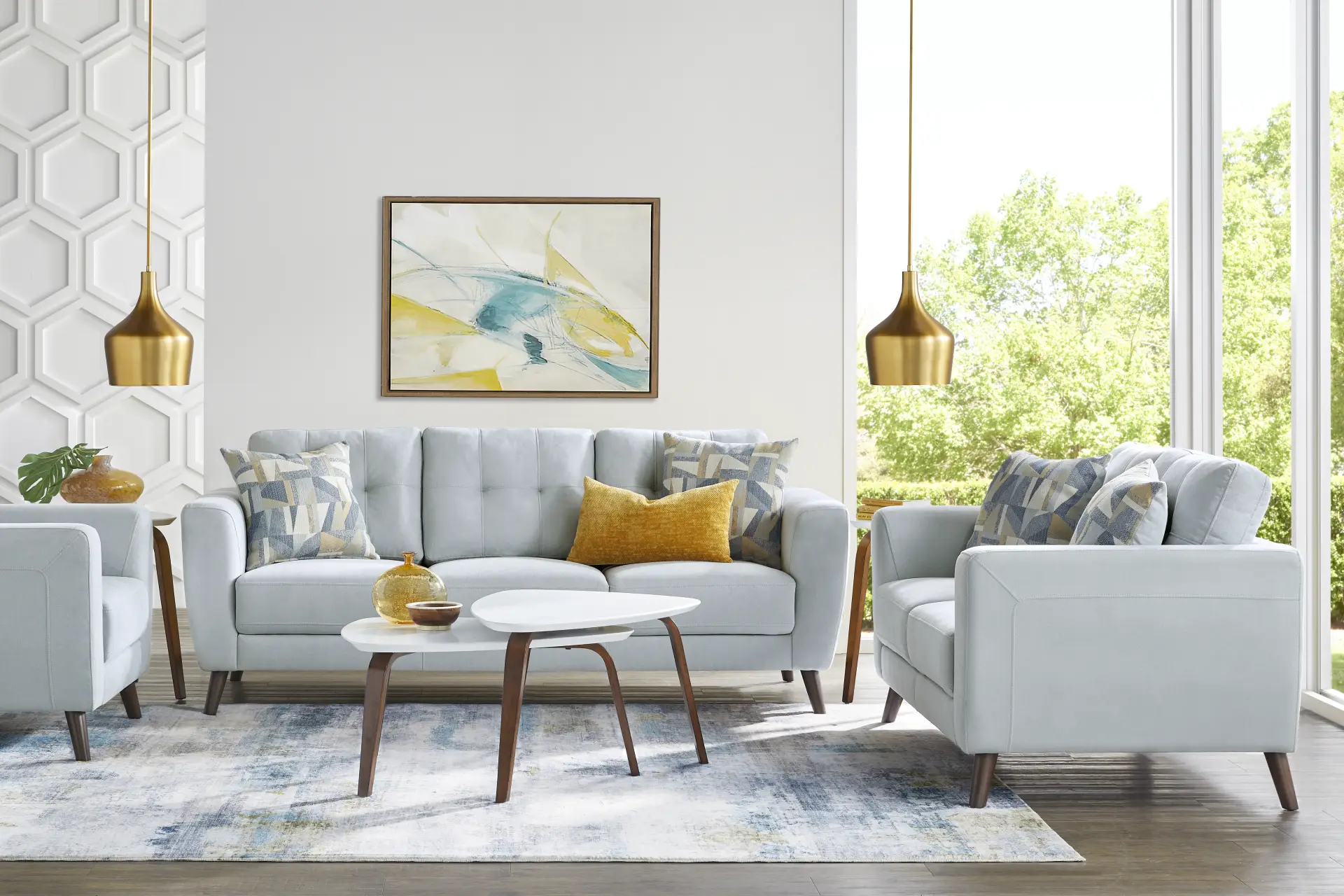 Bring a vibrant and upbeat feel to the everyday with the soft hues and casual design of the Claremont Heights living room. Upholstered in a woven fabric, this contemporary set features a padded outside frame with stylish flair arms for a relaxed feel, while button-tufted back cushions provide a touch of uptown class. Tall, tapered legs accentuate the soft blue upholstery while the attached seat and back cushions offer an added hint of luxury. Upholstery: 100% Polyester. Cleaning Instructions: Use water based cleaning agents or foam. Small yellow accent pillow not included.