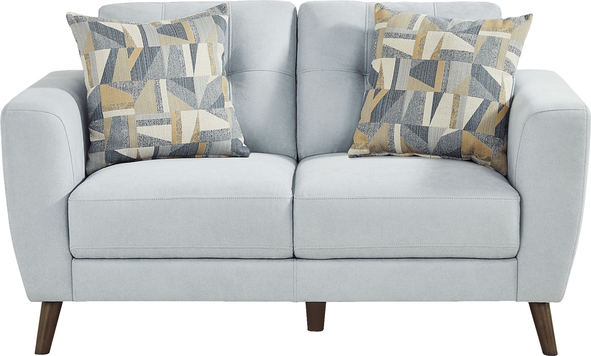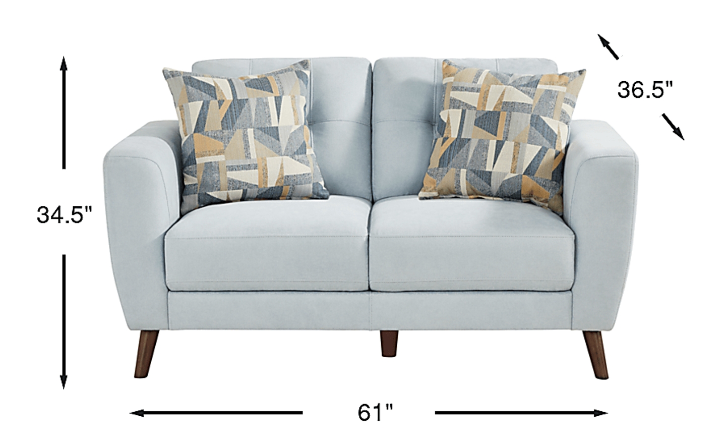 Bring a vibrant and upbeat feel to the everyday with the soft hues and casual design of the Claremont Heights loveseat. Upholstered in a woven fabric, this contemporary piece features a padded outside frame with stylish flair arms for a relaxed feel, while button-tufted back cushions provide a touch of uptown class. Tall, tapered legs accentuate the soft blue upholstery while the attached seat and back cushions offer an added hint of luxury. Upholstery: 100% Polyester.