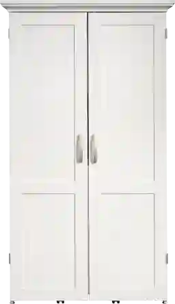 The Clarendony white storage cabinet functions as a craft/sewing armoire or office workspace. Shelf with full extension slides features drop leaf extension for extra work surface. Center shelf also features power strip with six outlets for convenient electrical access. Six adjustable shelves to accommodate a variety of items. Lower slide-out shelf features metal runners and safety stops. Customer assembly is required.