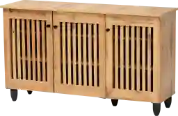 Featuring a modern design with ample storage space, the Claxtoon shoe cabinet upgrades any entryway. This cabinet is crafted from oak brown finished wood that adds visual warmth to any interior layout. Three doors conceal six shelves with storage space for up to 12 pairs of shoes, depending on size, featuring slatted doors to enable air circulation and prevent mold growth on your shoes. Tapered legs provide a convenient height, making this shoe cabinet a stylish and practical solution to entryway storage. Customer assembly is required.