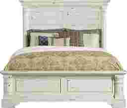Add a cozy dash of traditional-meets-rustic charm to your bedroom when you have the Claymore Park king bed. Crafted of solid pine and basswood veneers with a hand-applied distressed off-white finish, the panel-style bed features unique moulding details with carved column effects. Mattress and foundation (if required) sold separately. Bed shown is queen size.