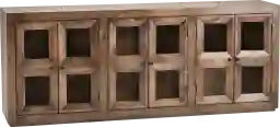 Transform your space with the Cleggy brown sideboard. The warm medium brown mango body, showcasing natural wood grain variations, pairs beautifully with four warm brown mango and glass doors featuring a windowpane design. Black knobs add a modern touch. Inside, three shelves offer ample storage, while three cord management holes keep cables tidy. Ships fully assembled for immediate enjoyment, combining style and convenience effortlessly.